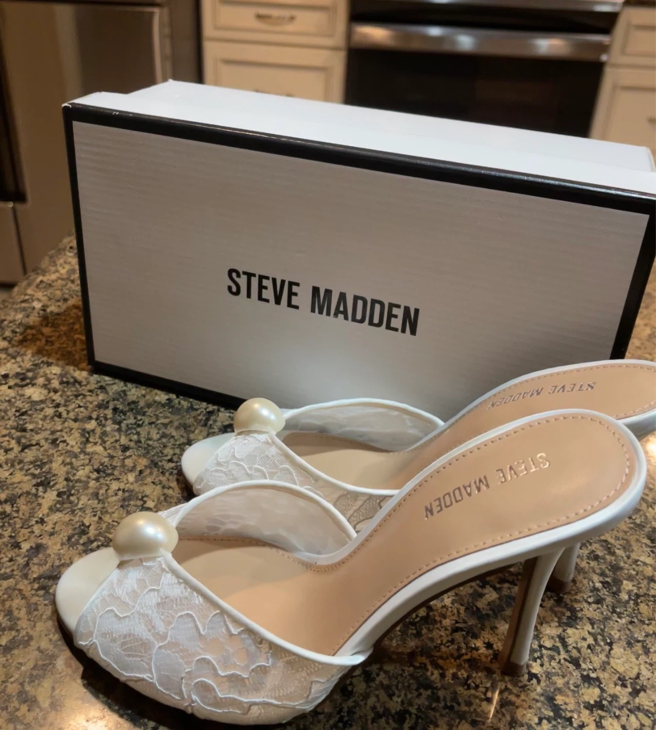Size 7 White lace heeled mules with pearl detail by Steve Madden. Comes with original box. These are slip-on style heels. (Local dropoffs and pickups only!π)