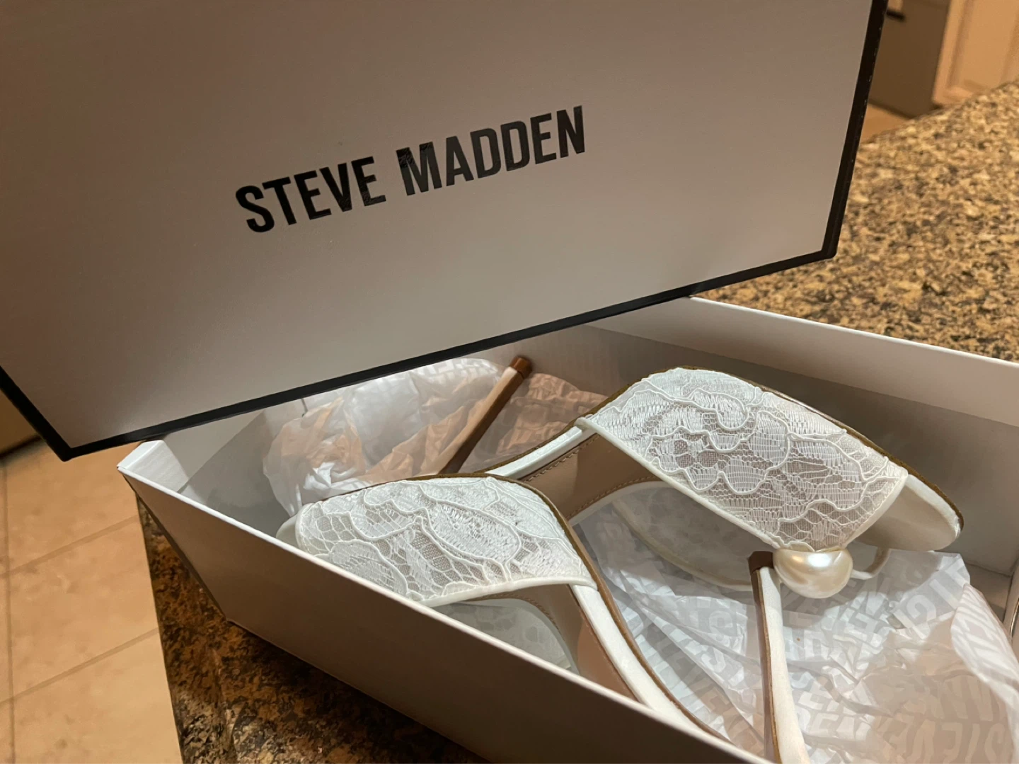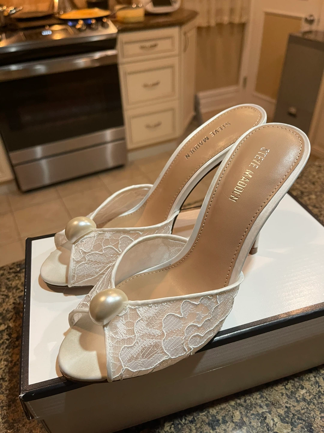 Size 7 White lace heeled mules with pearl detail by Steve Madden. Comes with original box. These are slip-on style heels. (Local dropoffs and pickups only!π)