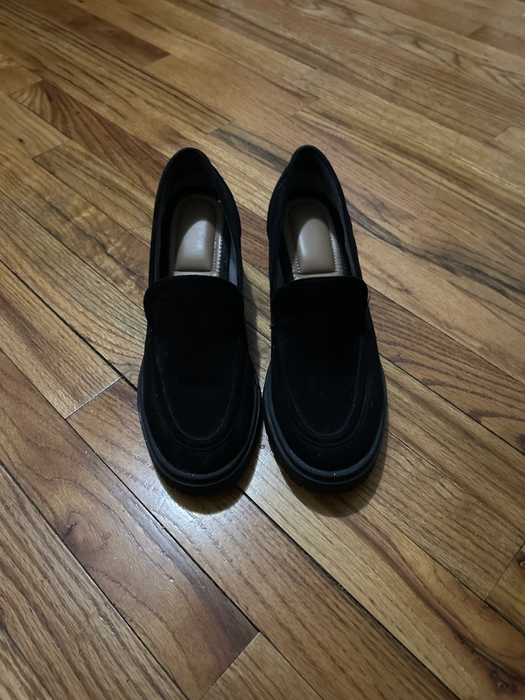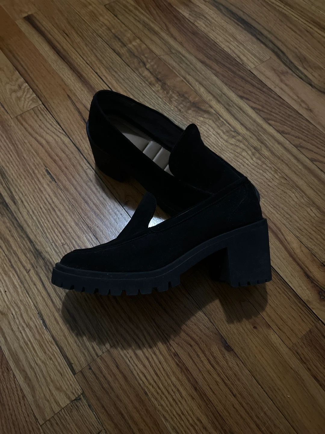 Selling a pair of stylish black suede heeled loafers! They're in great condition and ready for a new owner. These loafers feature a comfortable block heel and a classic design that can be dressed up or down. Does not come with box.