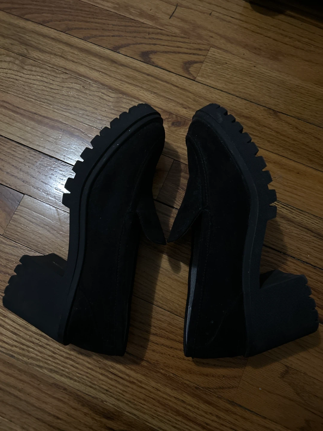 Selling a pair of stylish black suede heeled loafers! They're in great condition and ready for a new owner. These loafers feature a comfortable block heel and a classic design that can be dressed up or down. Does not come with box.