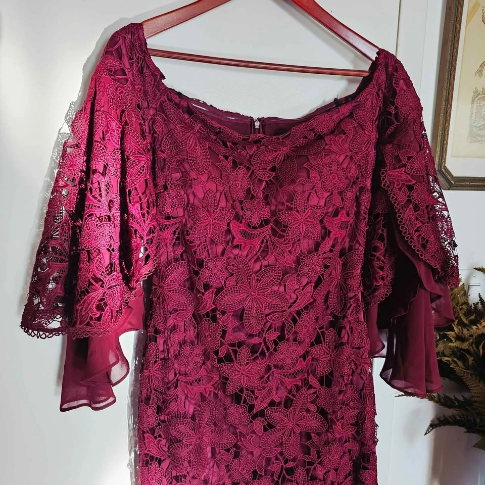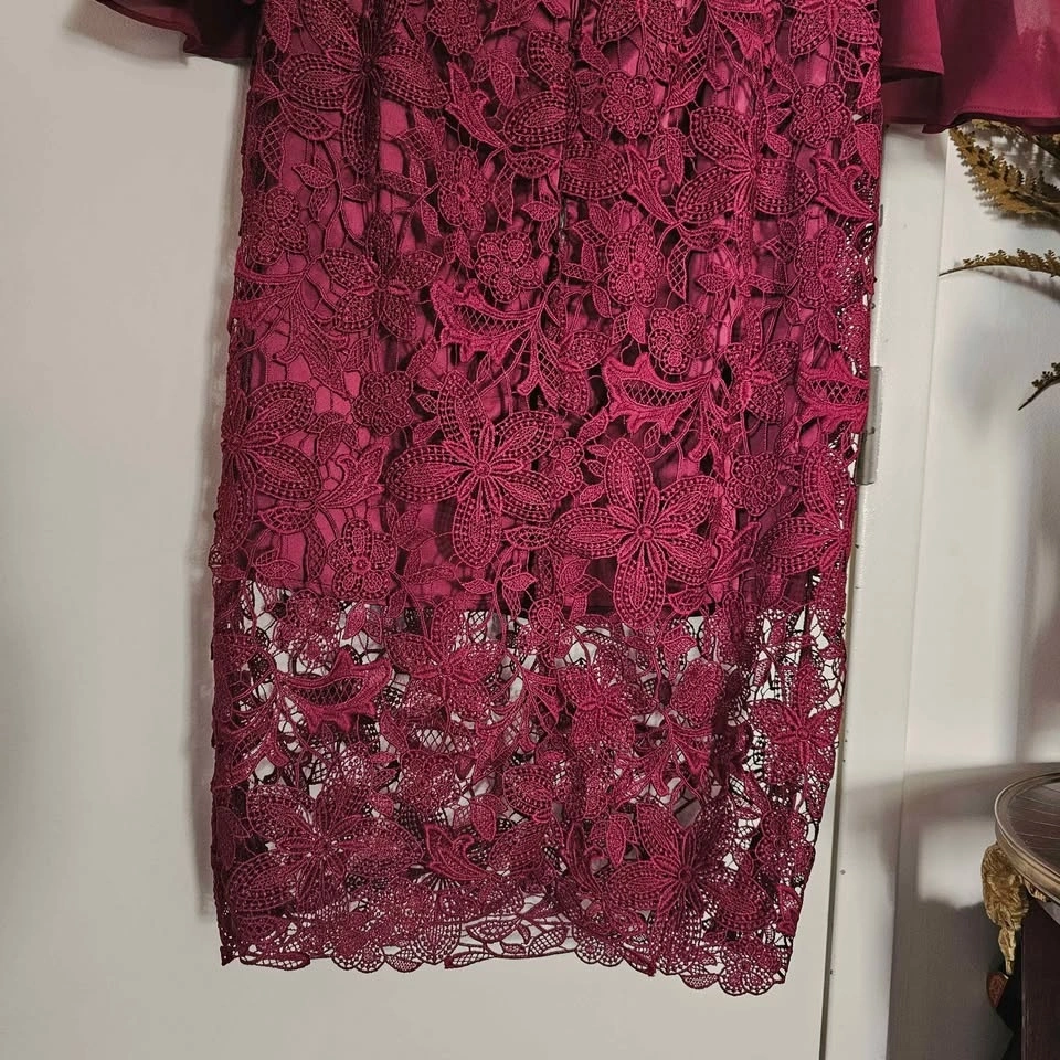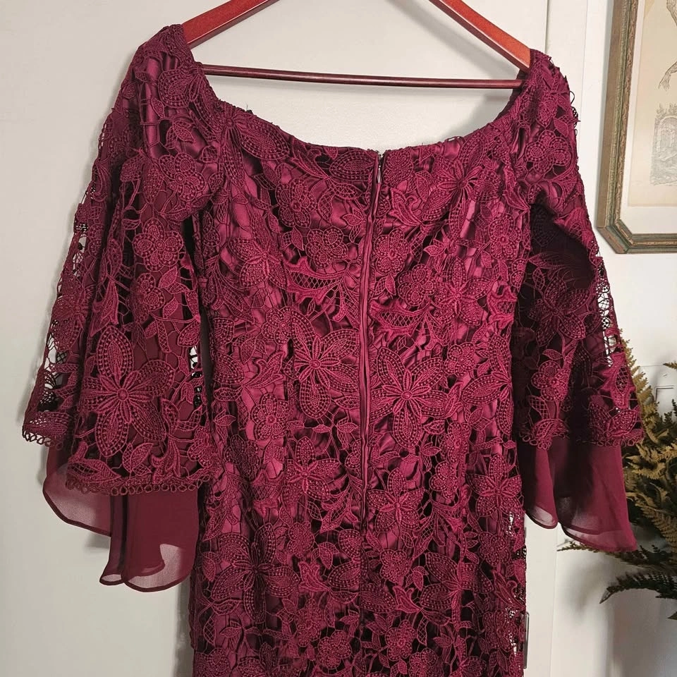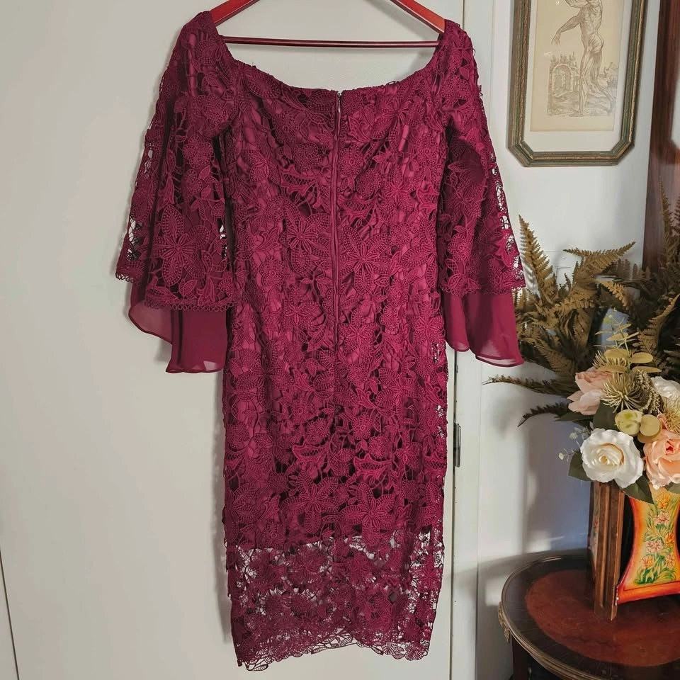 Beautiful lacy off-shoulder cocktail dress with dramatic tulip flutter sleeves from Laundry by Shelli Segal. The dress is a jewel tone wine/burgundy purple color.