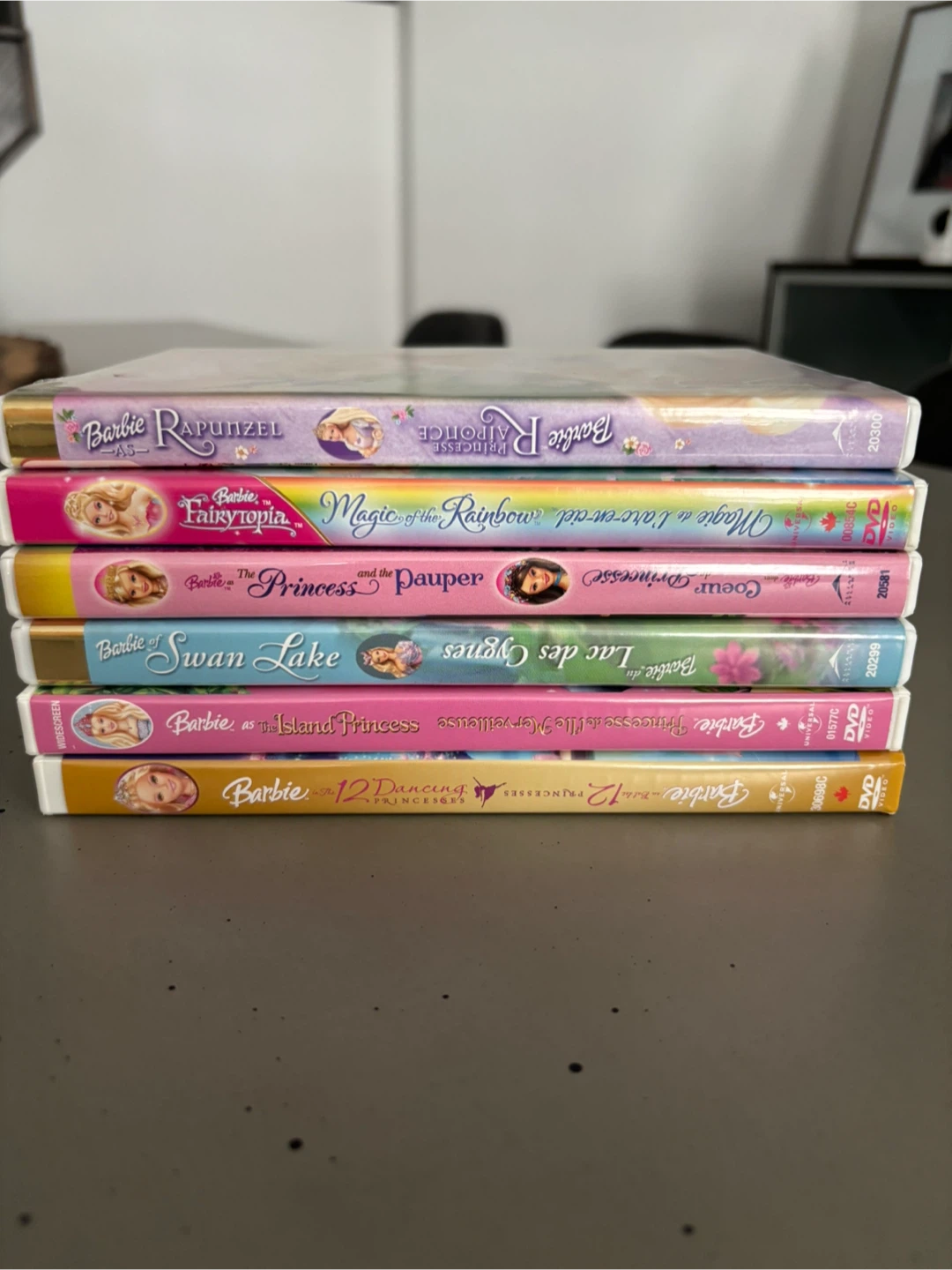 Includes Barbie as Rapunzel, Fairytopia, The Princess and the Pauper, Swan Lake, and the 12 Dancing Princesses. These are DVD format.