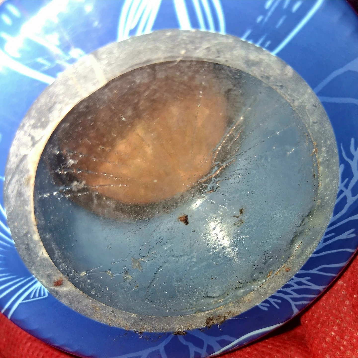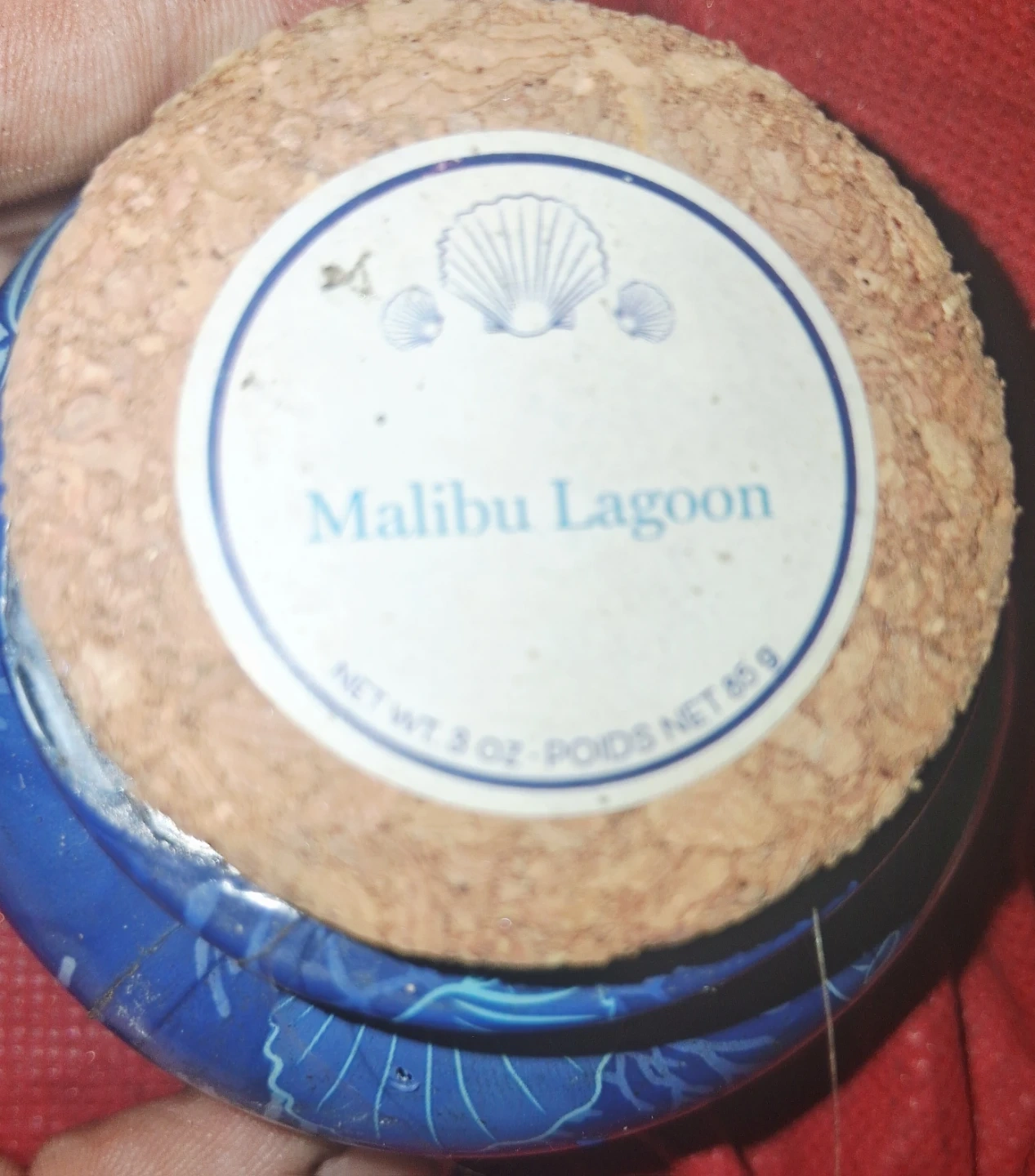 Decorative jar with a cork lid. Features a blue floral design and "Malibu Lagoon" branding. Net wt 5 oz. PICK UP ONLY UNLESS NEAR THE INTERSECTION OF OXFORD AND GAMMAGE ST.