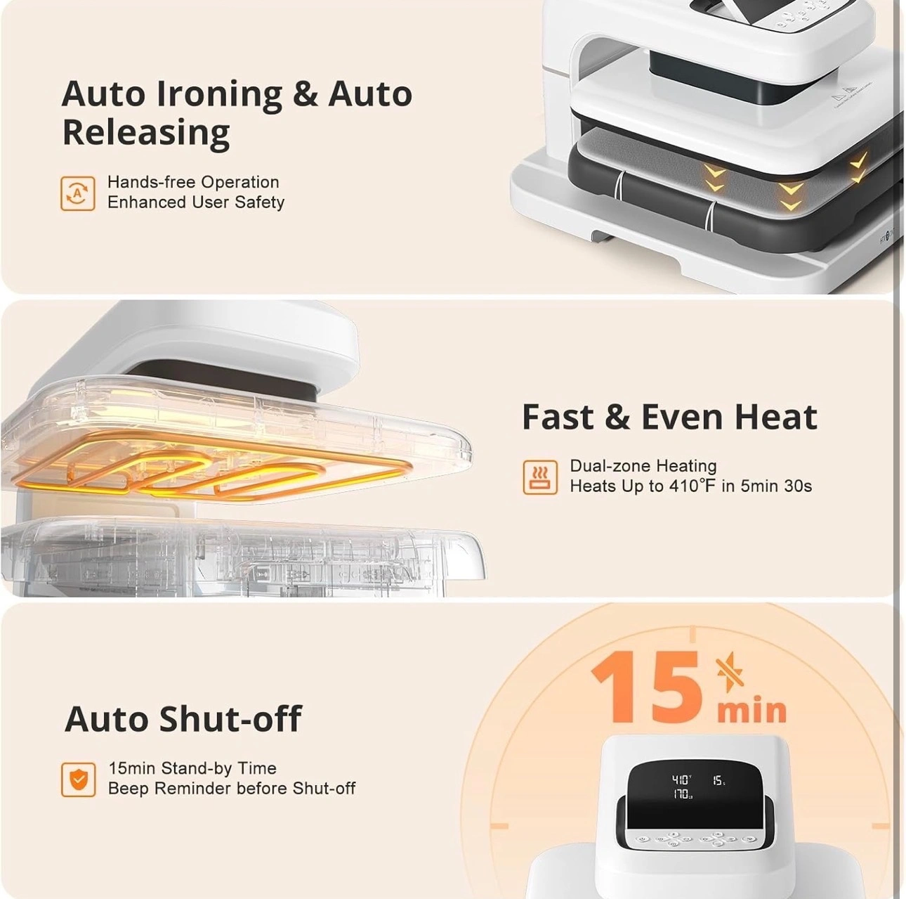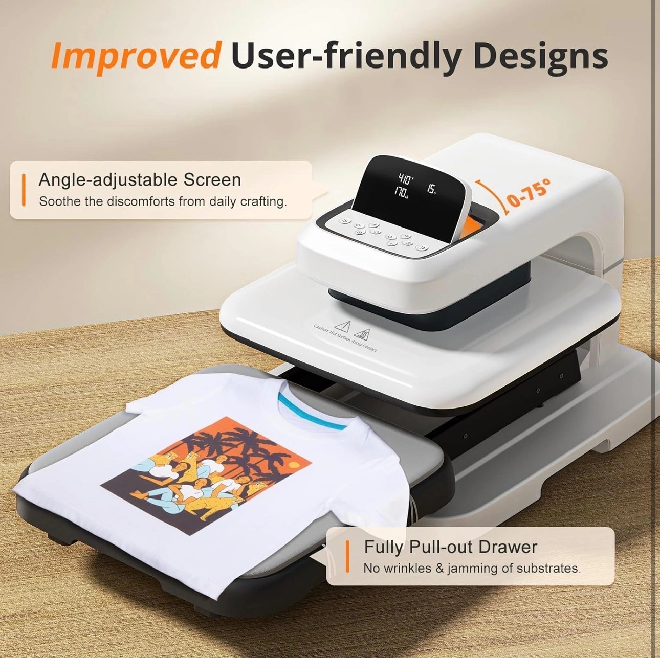 【Angle-Adjustable Screen & Auto-Off Feature】HTVRONT commits to every ergonomic detail for crafters. The screen angle provides 7 levels within the range of 0-75°and supports manual adjustment, making creation more comfortable. Moreover, HTVRONT sublimation heat press takes users' safety with full concern. Our shirt heat press will auto shut up if no operation after 15 minutes. No worries about overheating.