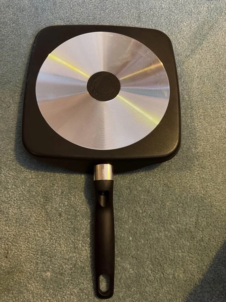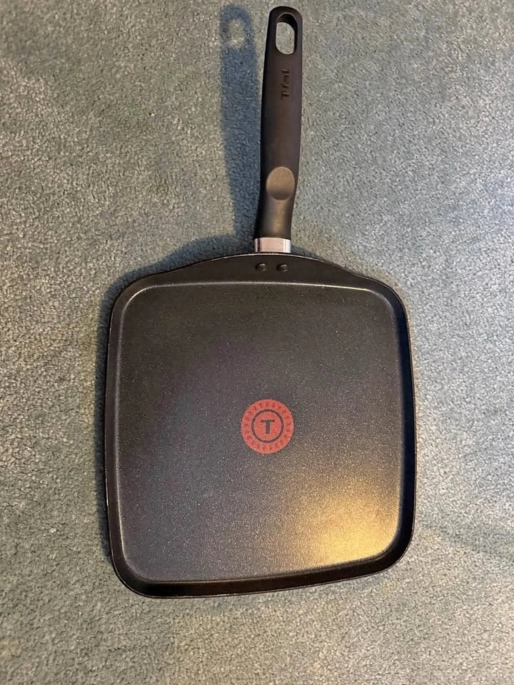 T-fal square griddle pan. Features a ProGlide non-stick interior for easy food release and cleanup. Includes T-fal's unique Thermo-Spot heat indicator, which changes color when the pan reaches the optimal temperature for cooking. Made with durable aluminum construction for fast and even heating. The pan is dishwasher safe for convenience. New never used. Retails for $60.