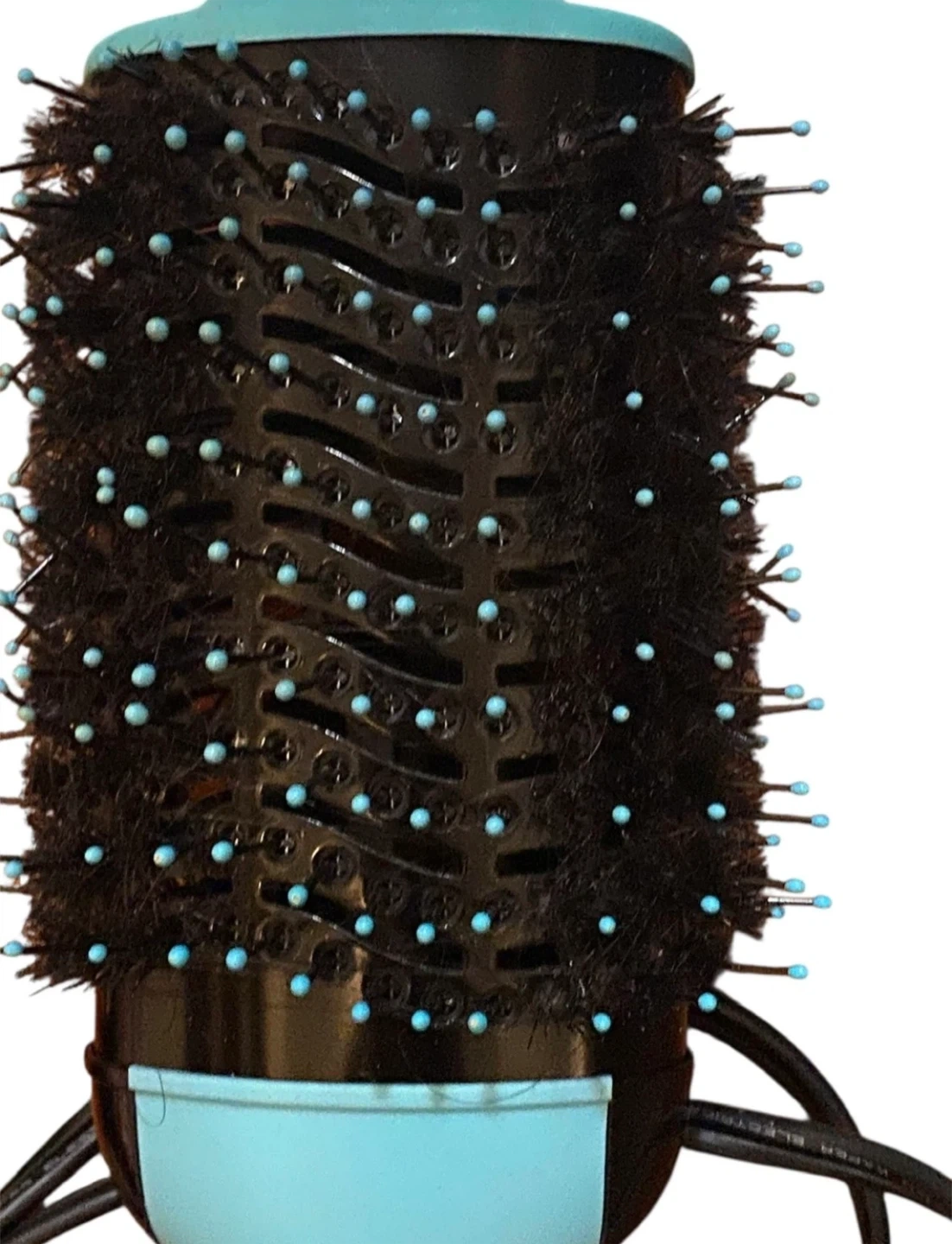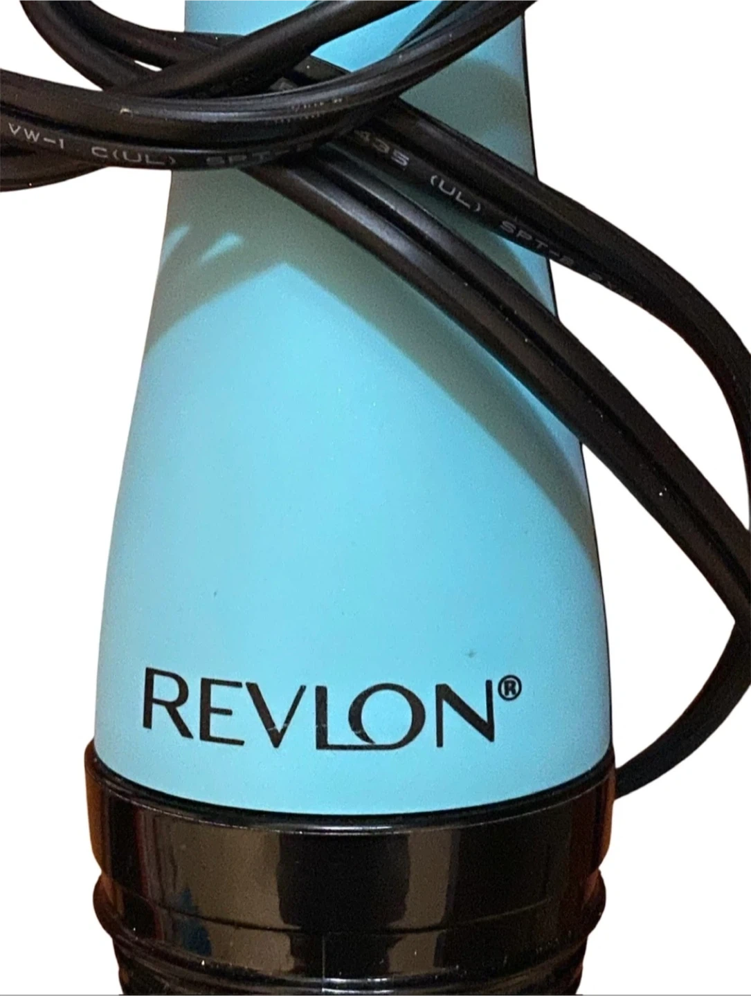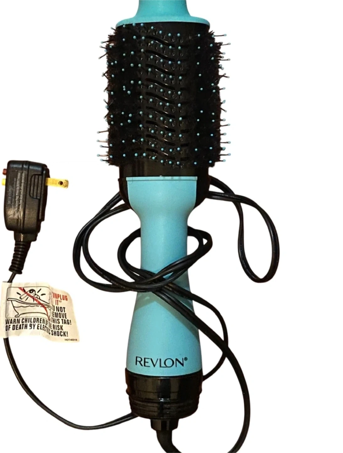 This is a Revlon One-Step Hair Dryer and Volumizer. It features a teal handle and a black barrel with blue accents. Get salon-quality blowouts at home!