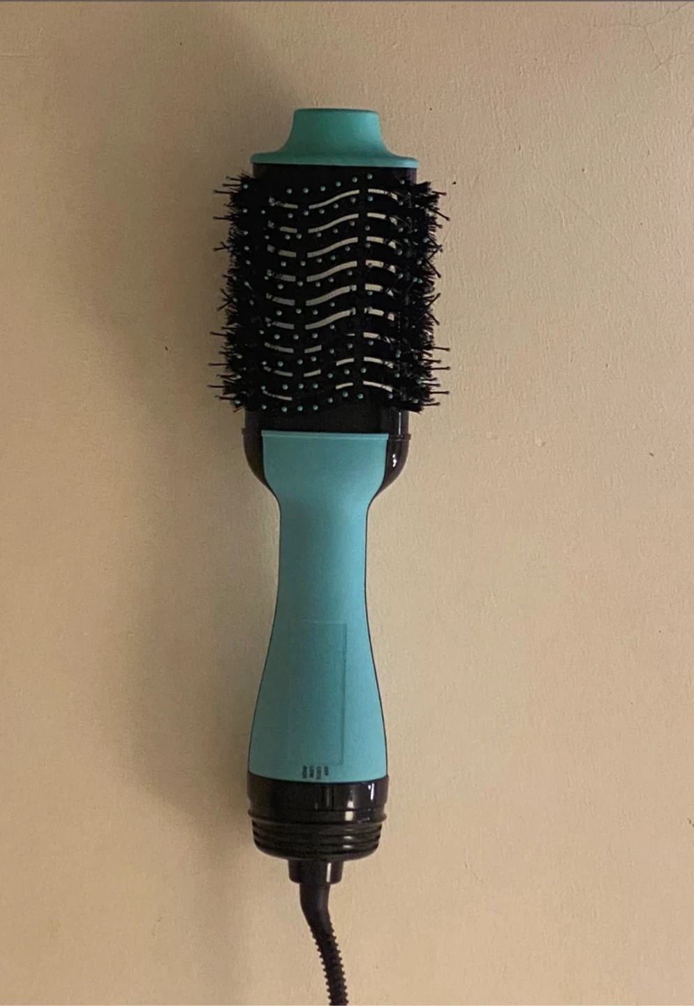 This is a Revlon One-Step Hair Dryer and Volumizer. It features a teal handle and a black barrel with blue accents. Get salon-quality blowouts at home!