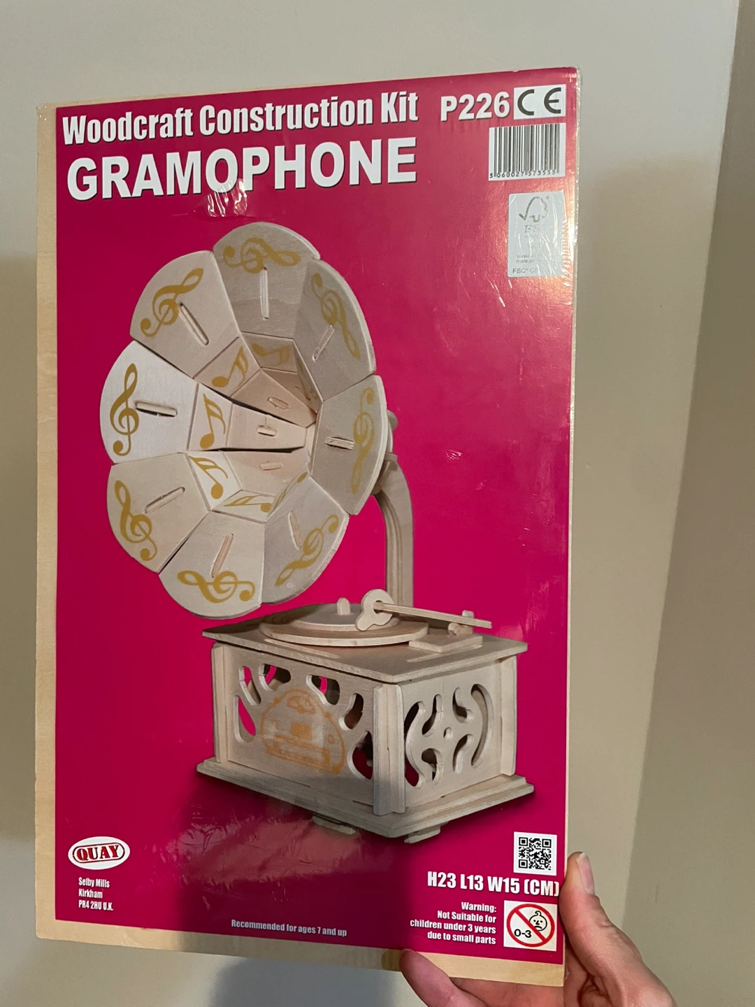 This is a Woodcraft Construction Kit for a gramophone. It's recommended for ages 7 and up. The kit includes pre-cut wooden pieces for assembly.