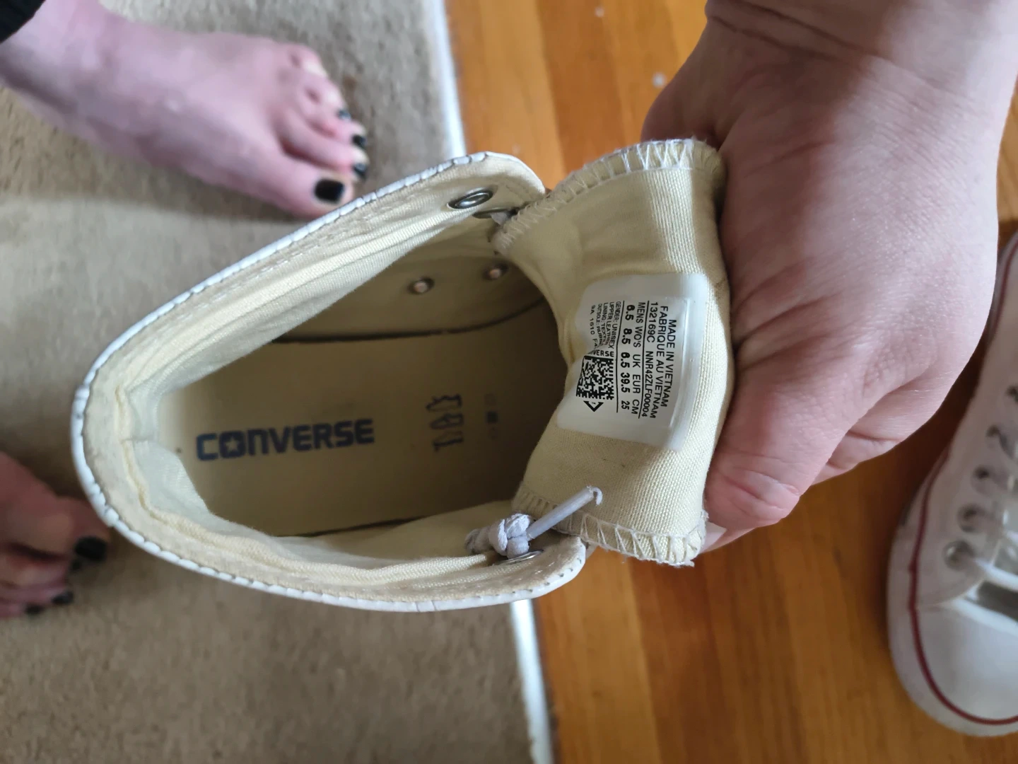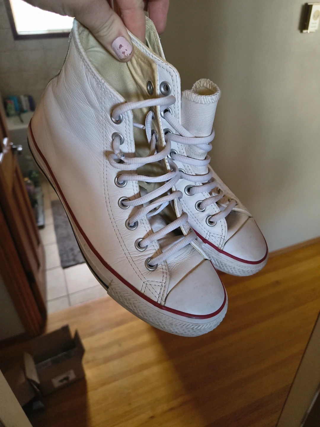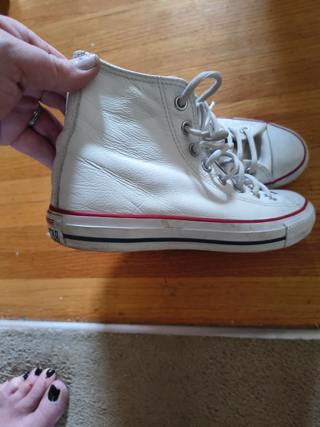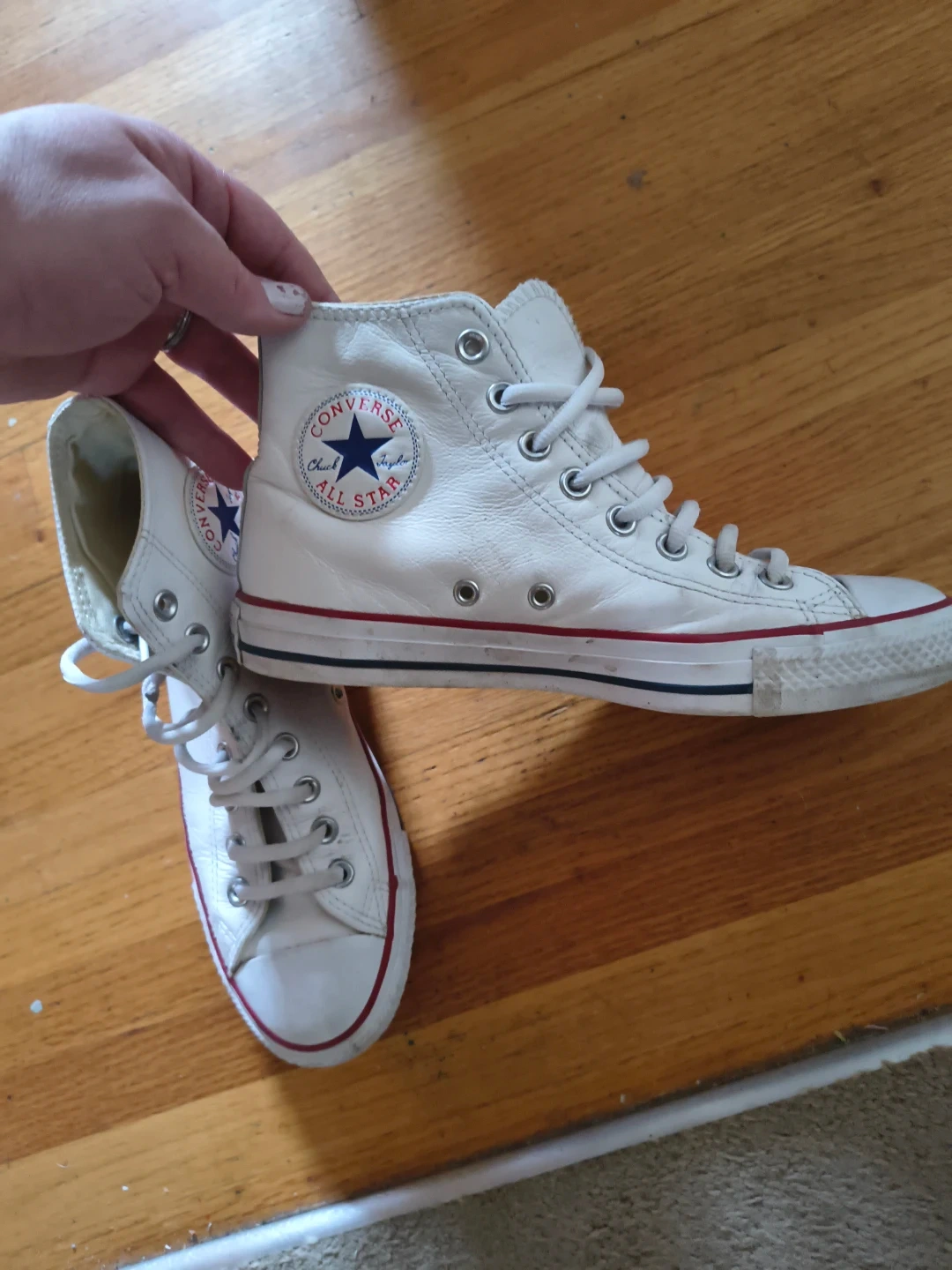 Buy & SellConverse All Star High Top Leather SneakersConverse All Star High Top Leather Sneakers$40White leather Converse high top sneakers with red and blue trim. Size 8.5 woman's 6.5mensConditionLike newBrandConverseWHERE TO MEETGlenbrook community hallView MapSELLERverifiedKristinGlenbrook650 reviews1 chats·1 favorites·13 viewsSEND CHAT TO SELLERHi Kristin! I’m interested in your listing.Hi Kristin! I’m interested in your listing.Get the Karrot app to chatSign In to chat