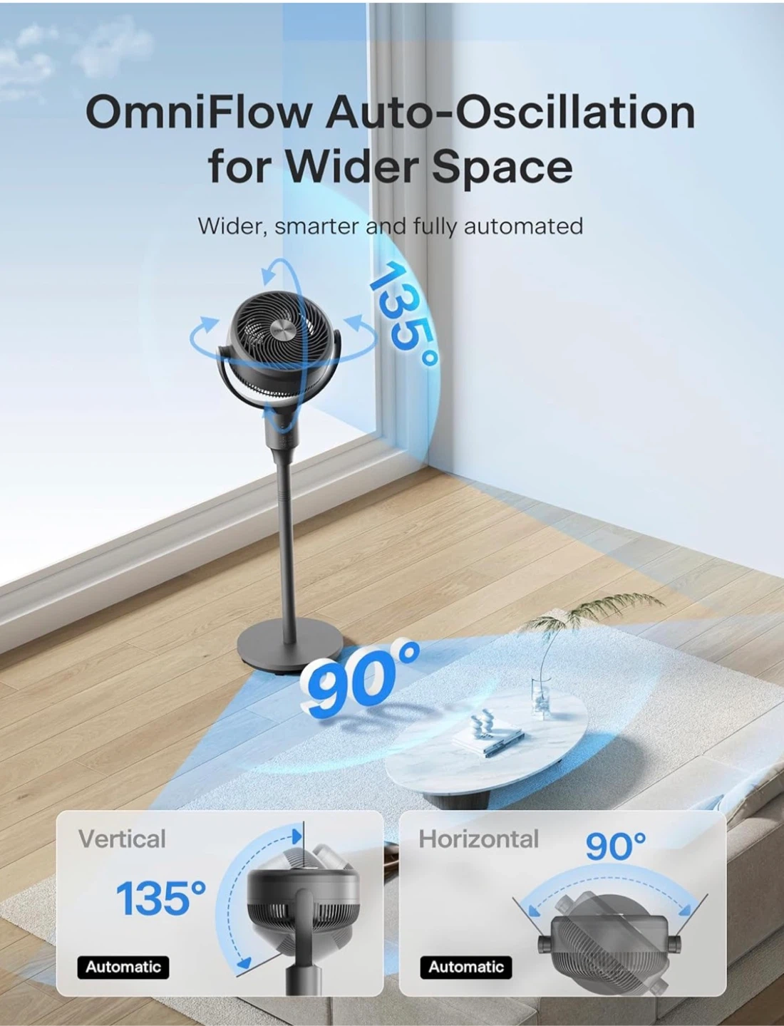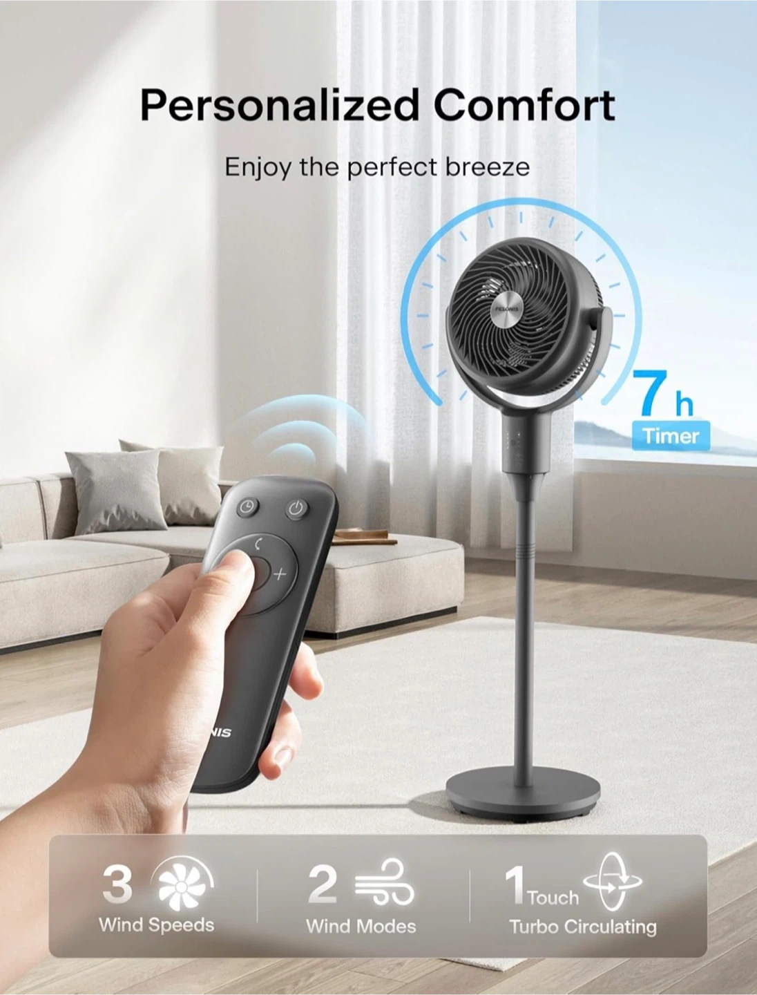 This versatile fan offers 4-in-1 functions: pedestal, omni-directional, and air circulation. It features 135° vertical and 90° horizontal oscillation for wider space coverage. The fan comes with 3 wind speeds, 2 wind modes, and a 7-hour timer, all controllable by remote. It’s 42.5 inches as a floor fan.