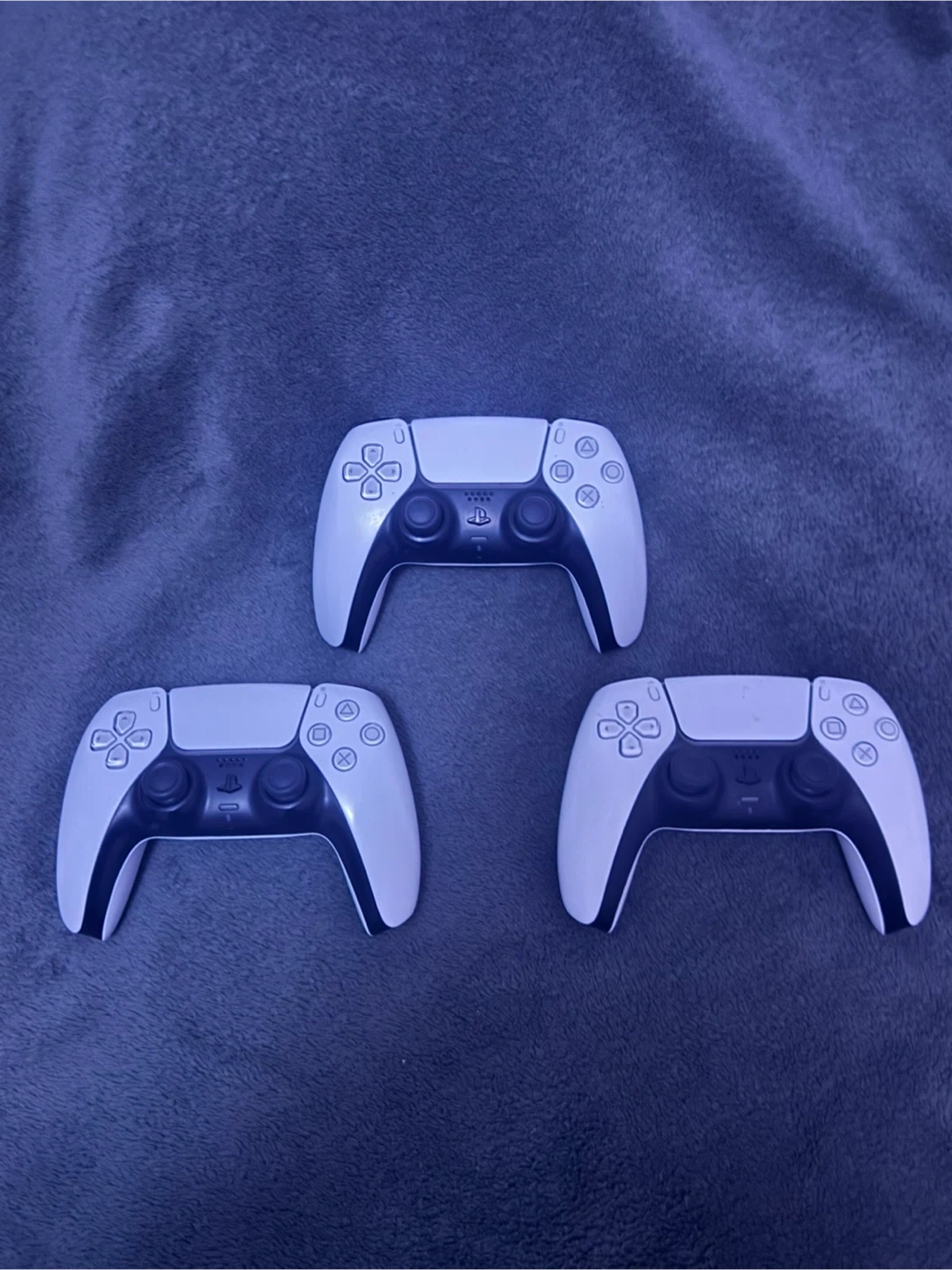 Selling three white Sony DualSense wireless controllers for the PlayStation 5. Lightly used with some very small scuffs.