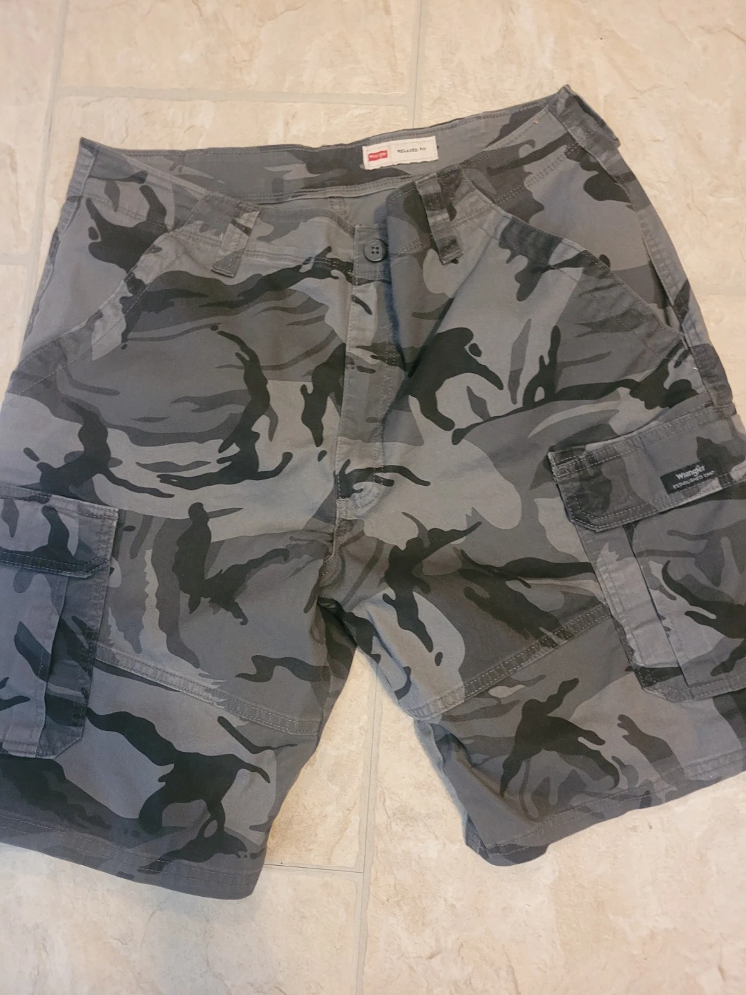 Selling a pair of Wrangler relaxed fit cargo shorts in a cool camo pattern! These shorts are perfect for casual wear or outdoor adventures. They're comfortable and have plenty of pocket space.