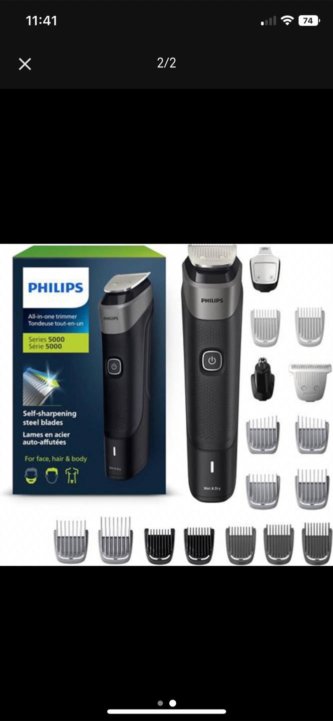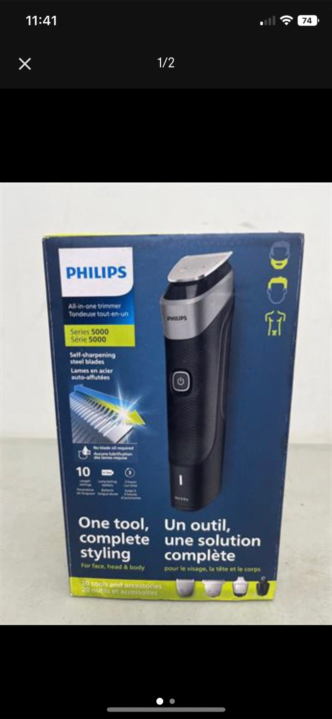 Selling a Philips Series 5000 all-in-one trimmer. It's perfect for face, head, and body grooming. The box includes 10 tools and accessories to complete your styling needs. The trimmer features self-sharpening steel blades for a precise and even cut every time
