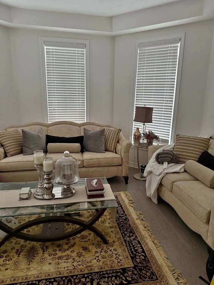 Beautiful matching set in excellent used condition, perfect for any living room with its neutral look. Very comfortable, well-kept cushions. No stains or damage. Neutral color that works with any décor. Sturdy frame, high-quality material. Includes rug and coffee table. Open to reasonable offers.