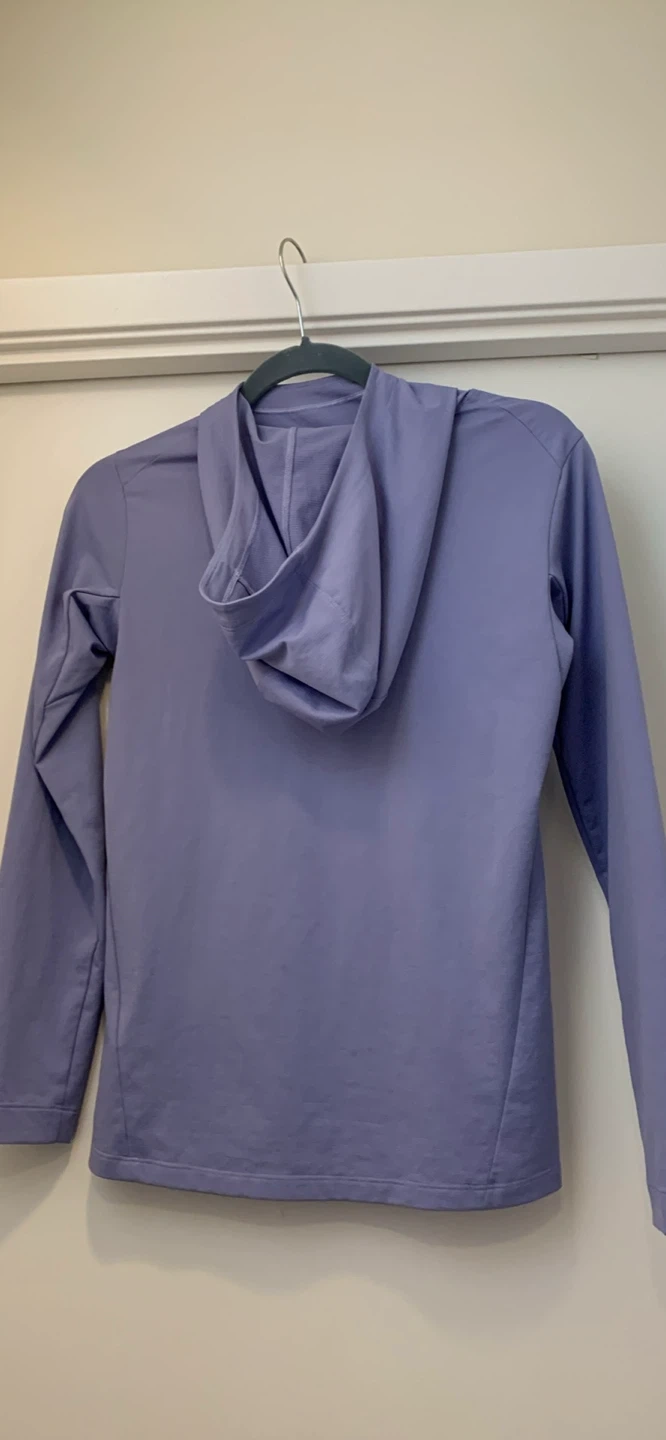This is an Arc'teryx Taema Hoody W. It's a Double Extra Small size. The colour is Moonstone Heather. It has a hood.
