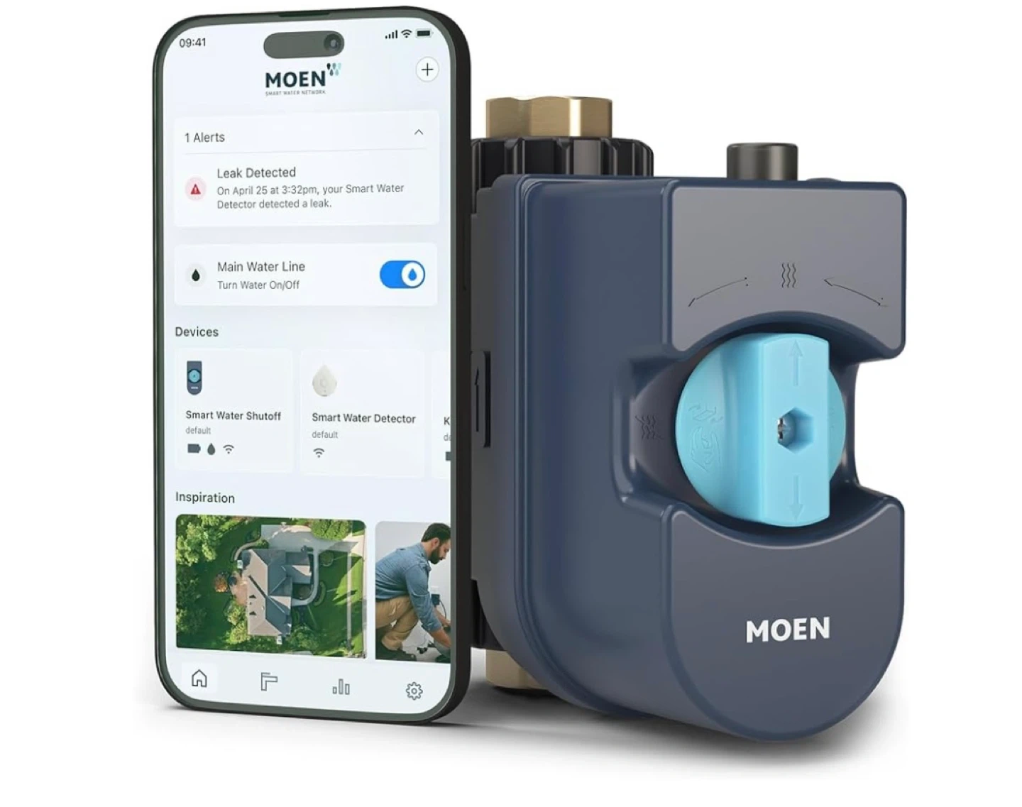 This Moen Smart Water Network system includes a smart water shutoff and detector. It can detect leaks and automatically turn off the main water line. The system is controlled via a smartphone app.