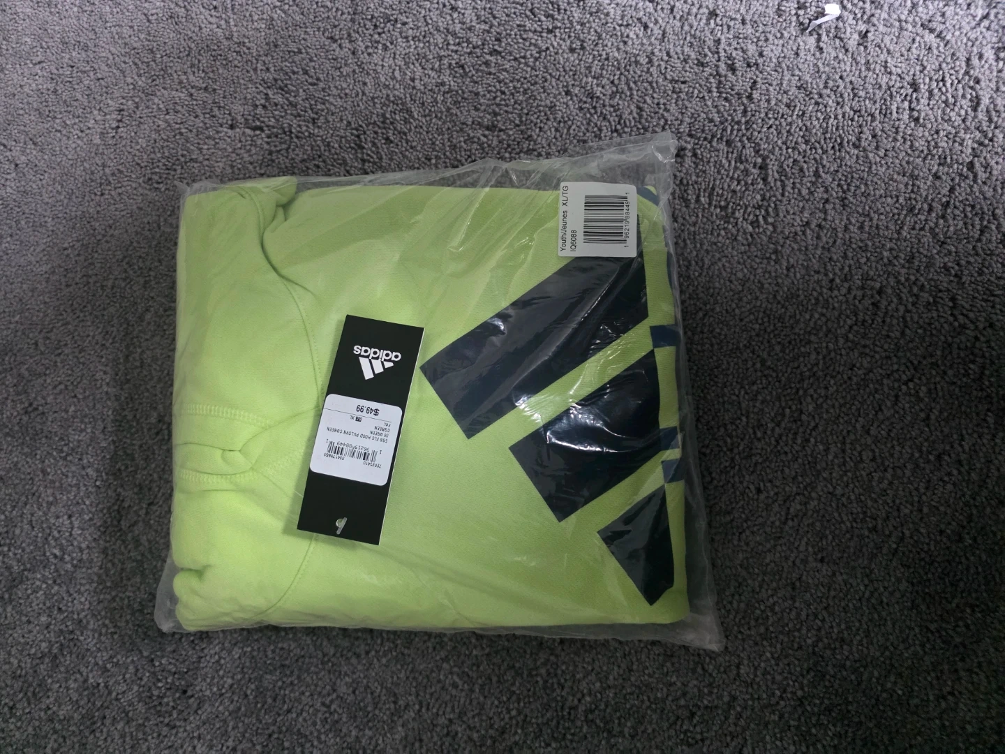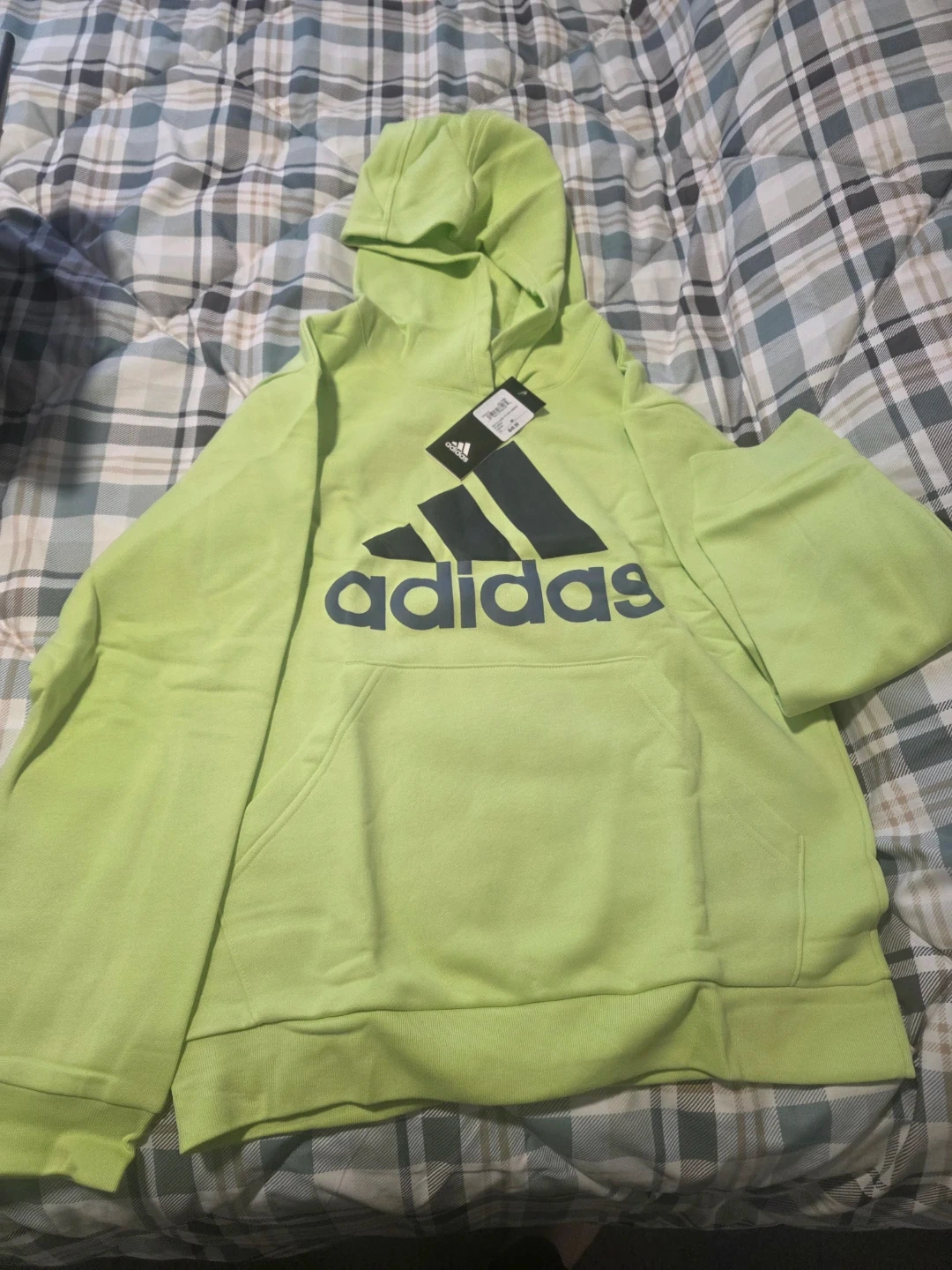 This is an Adidas hoodie. It's a bright lime green colour with a large black Adidas logo on the front. It has a kangaroo pocket and a hood.