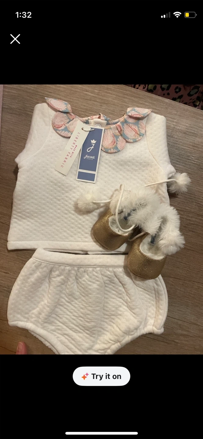 Adorable Jacadi three-piece set for baby girls. Includes a white quilted top with a floral ruffle collar, matching white quilted bloomers, and sparkly gold shoes with faux fur trim. Made with Liberty Fabric.