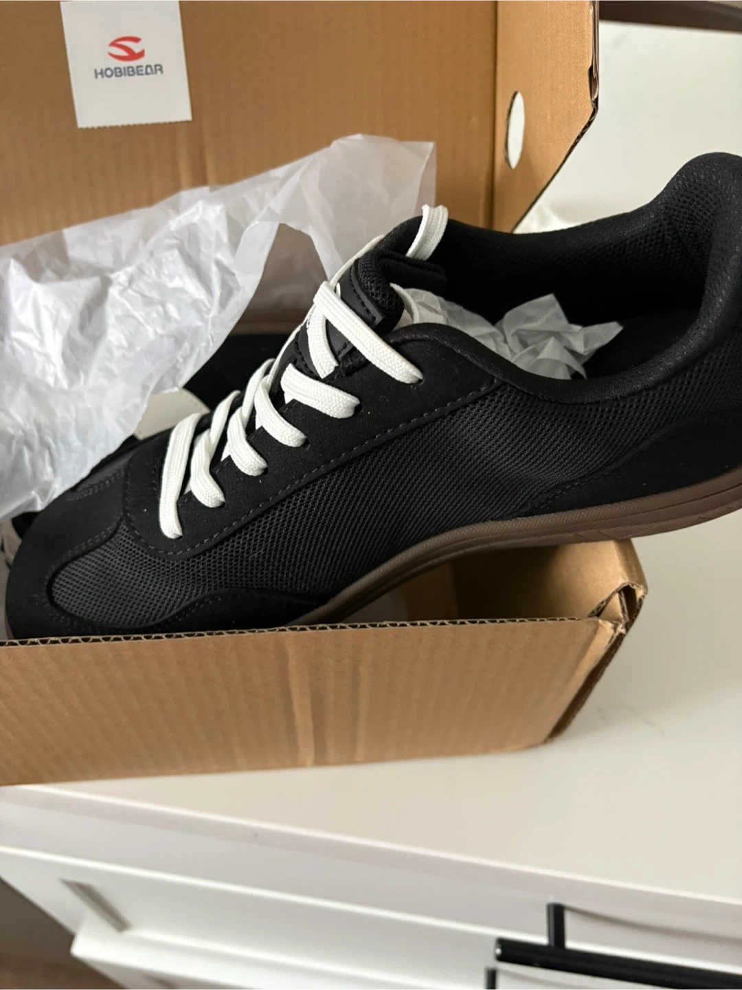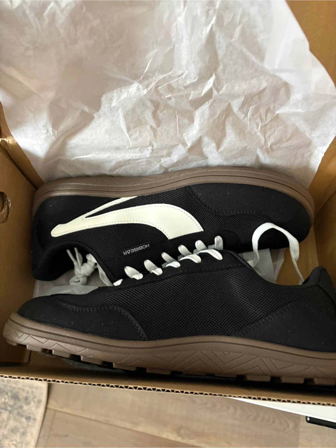These are new HOBI BEAR men's shoes. Black colour with a white stripe and brown sole. Includes original box.