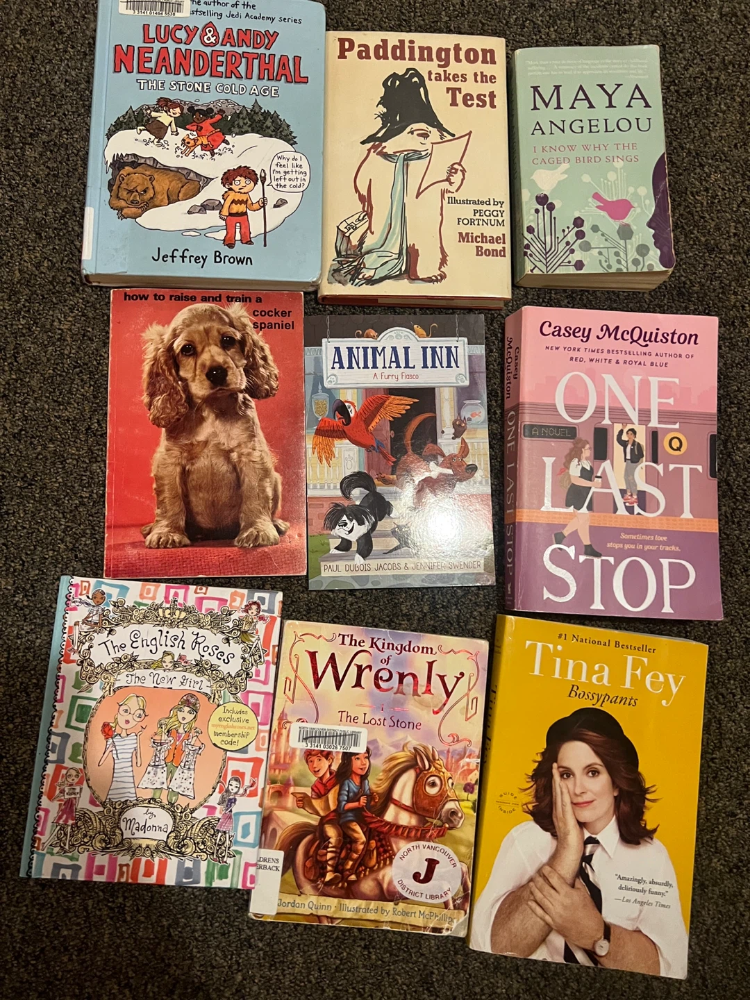 A selection of books including children's stories like 'Lucy & Andy Neanderthal' and 'The Kingdom of Wrenly', as well as adult titles such as 'Bossypants' by Tina Fey and 'One Last Stop' by Casey McQuiston. Also includes a book on raising a cocker spaniel. $3 to $8 each or buy all for $30
