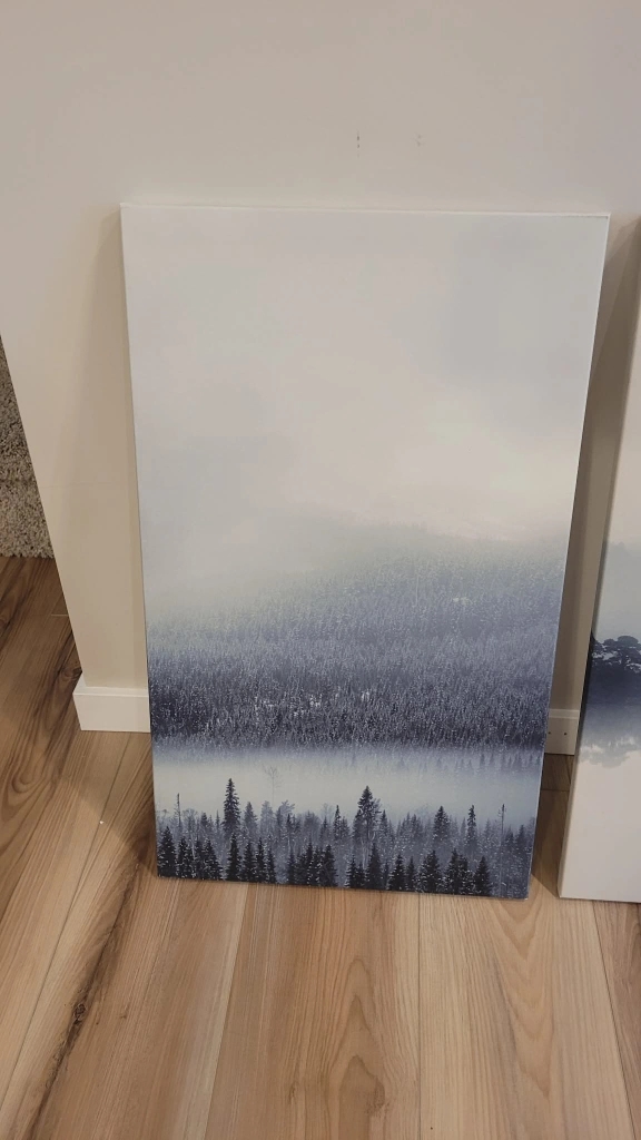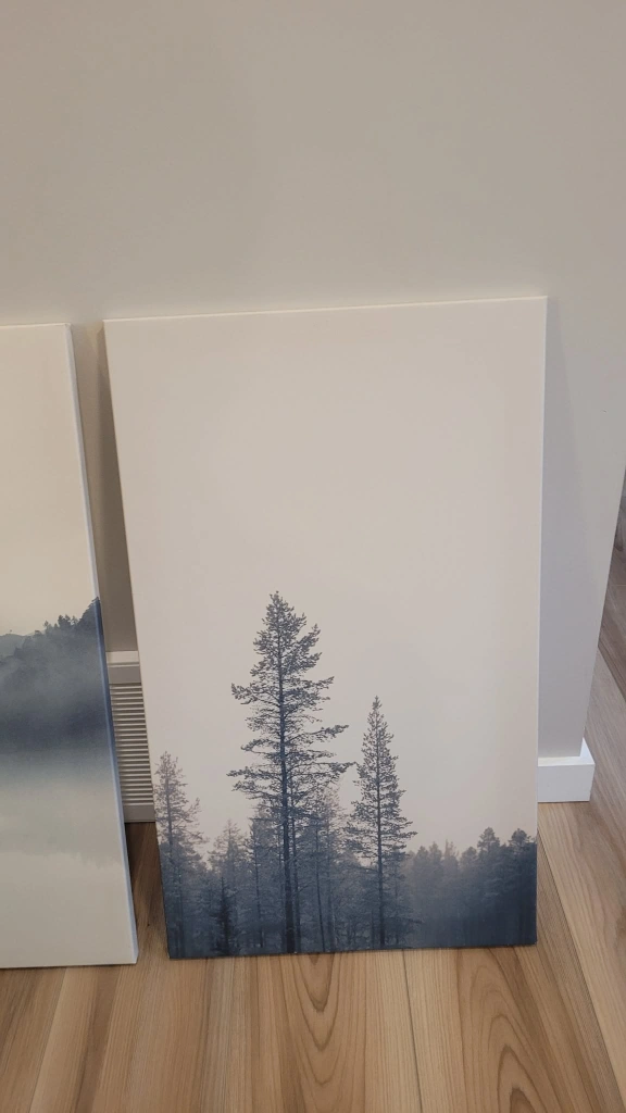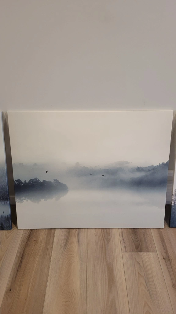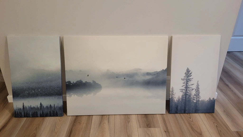 This set includes three canvas prints featuring serene misty forest landscapes. They are ready to hang and add a touch of nature to your home decor. Each piece showcases a unique misty forest scene with birds flying in the sky.