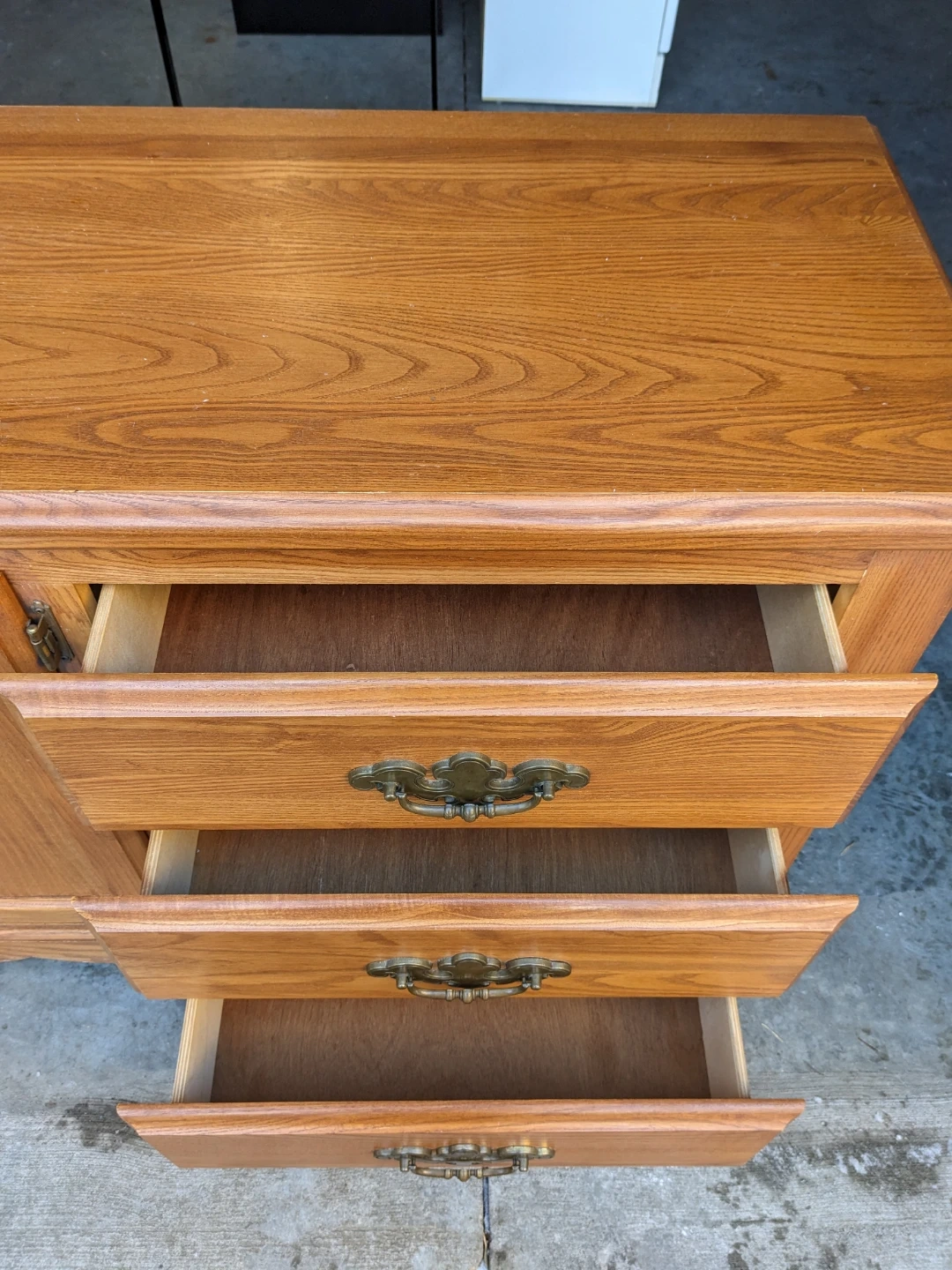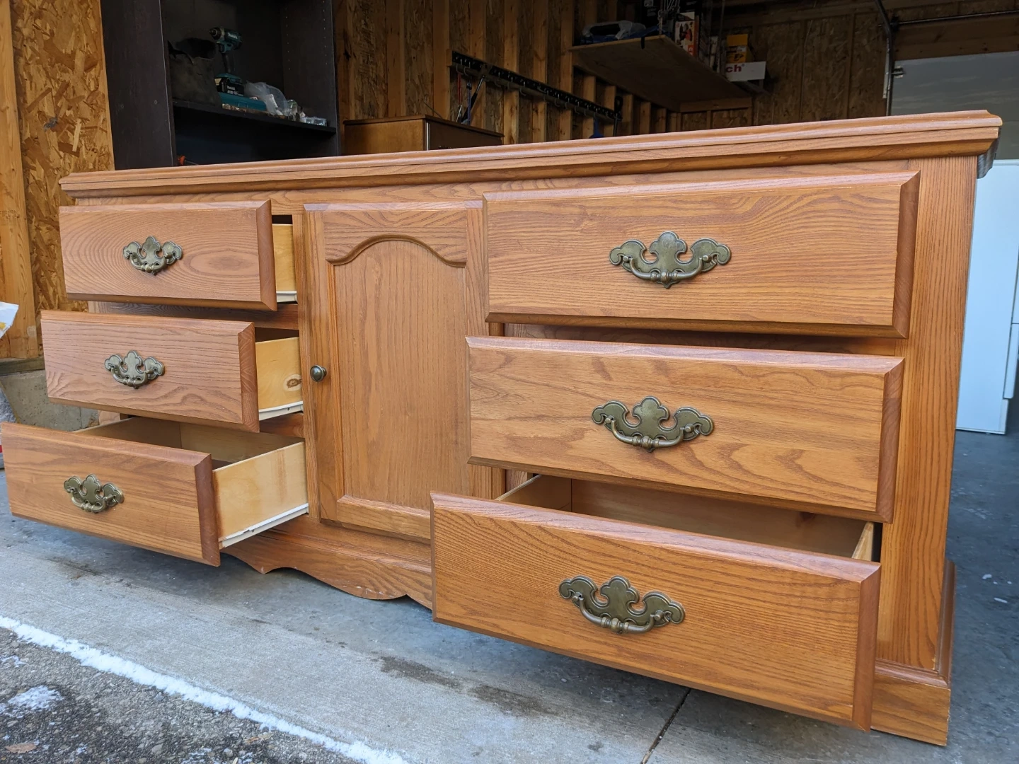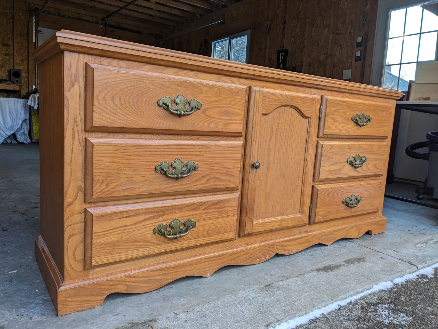 This 6 drawer/cabinet combo in solid oak features spacious drawers as well as a cabinet with 2 shelves for additional storage. The drawers all work perfectly on their metal slides with security stops and are in excellent condition inside. This is a solid and sturdy premium oak piece that is built to last. The durable antique bronze pulls as well the scalloped edging of the base give this dresser a traditional charm.