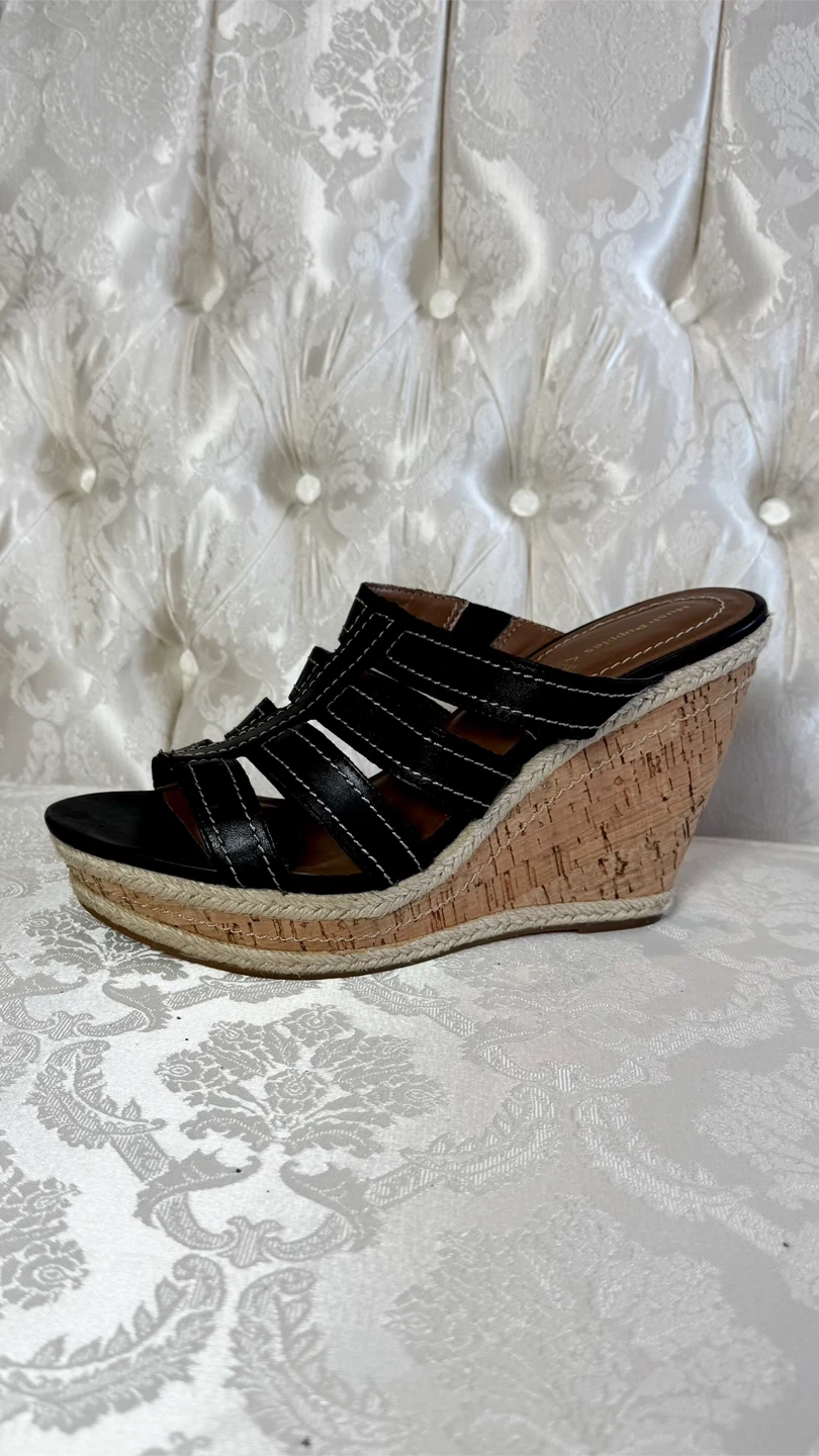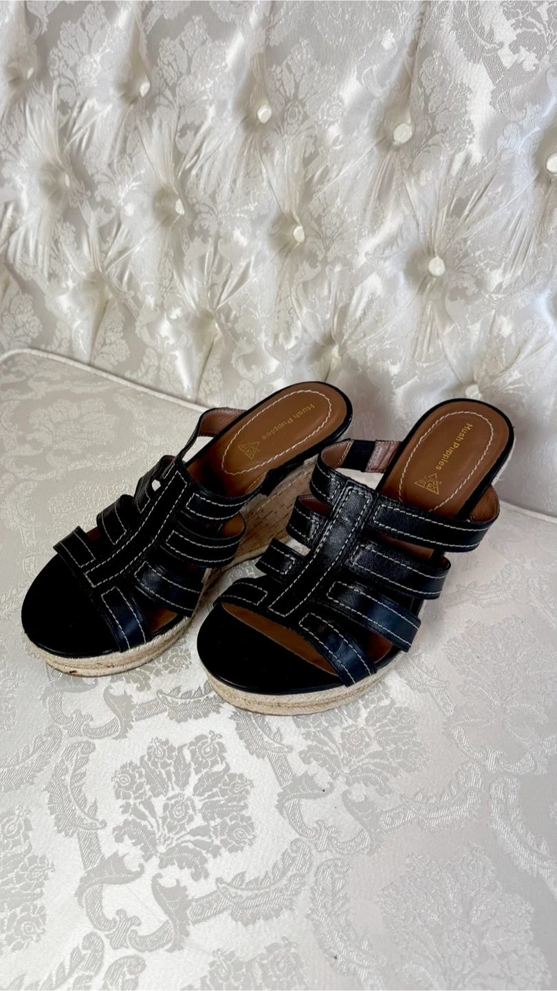 These are Hush Puppies black wedge slide sandals. They're made with a black authentic leather upper and a cork wedge heel. Includes the original box. Never worn.
