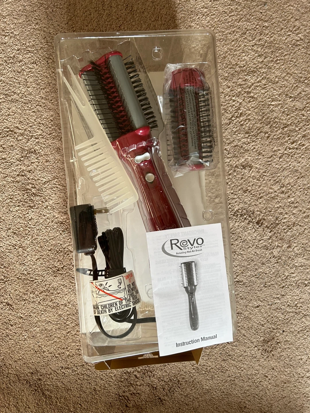 It's a Revo Styler Rotating Hot Air Brush, complete with an instruction manual. Its rotating barrel helps to style hair while drying. NEW, never been used.