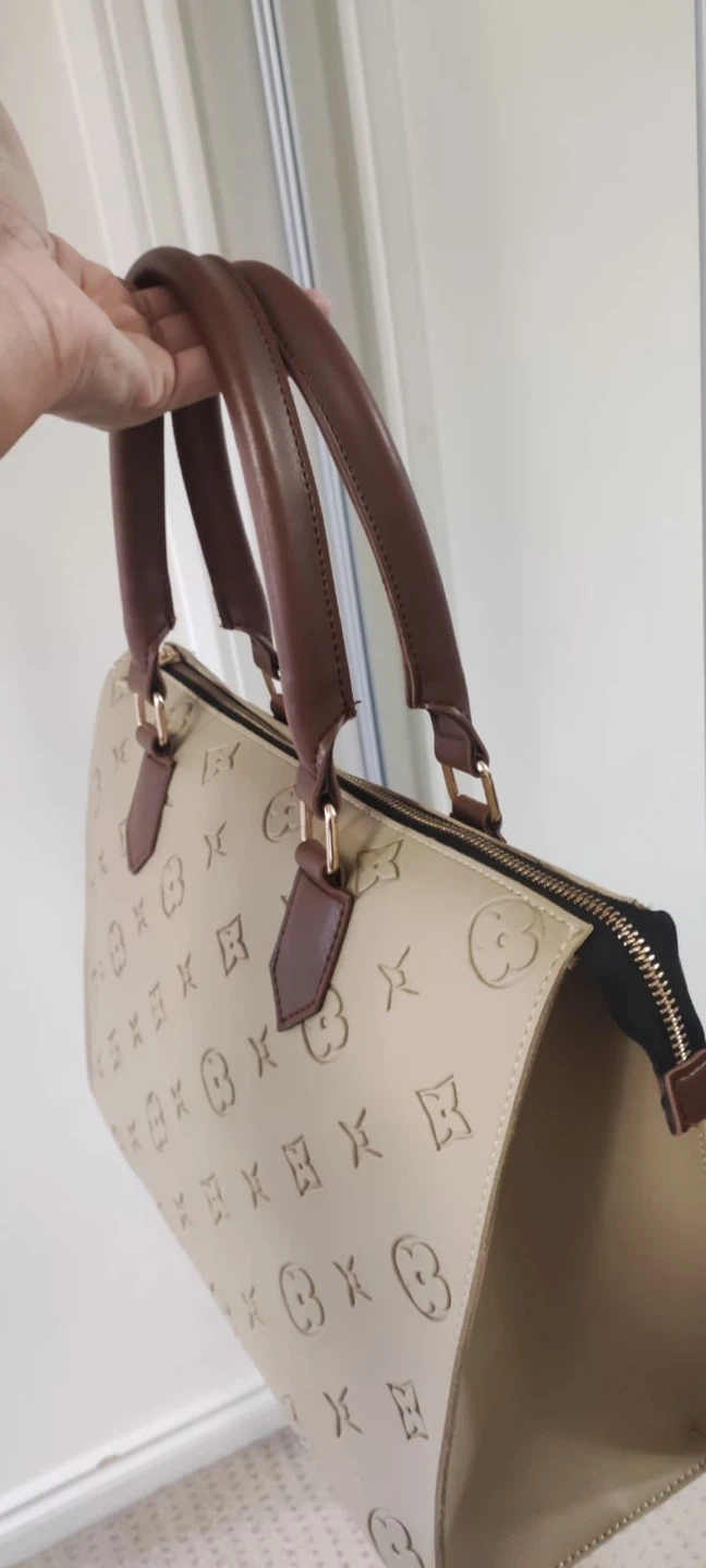 Elevate your style with this vibrant and beautiful design handbag featuring a sleek brown handle and strap.