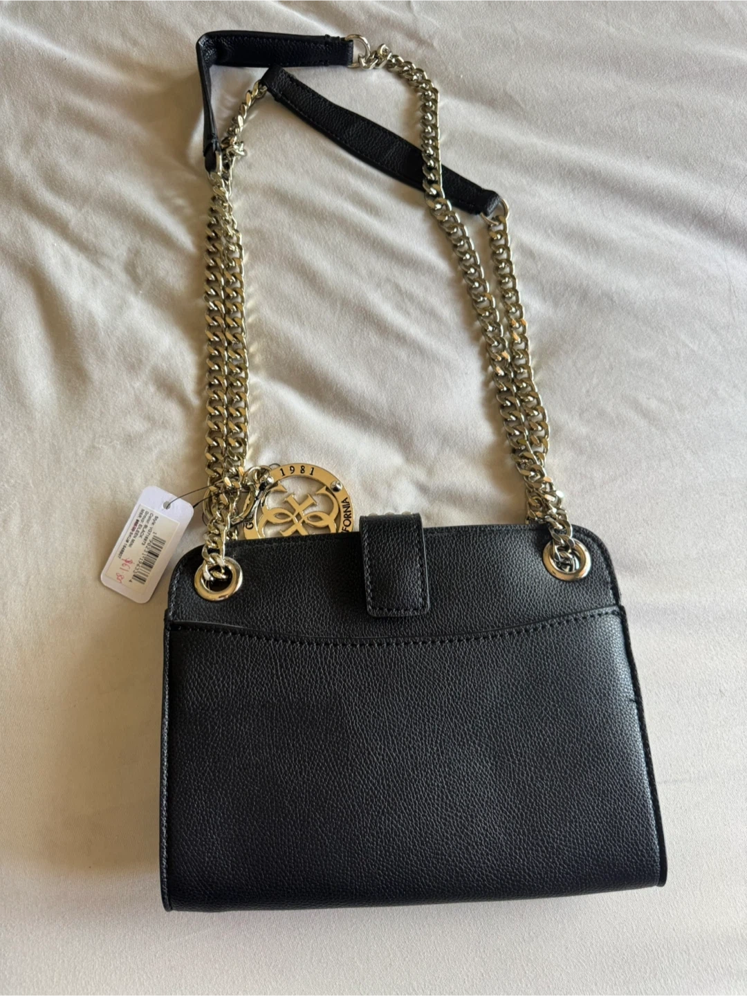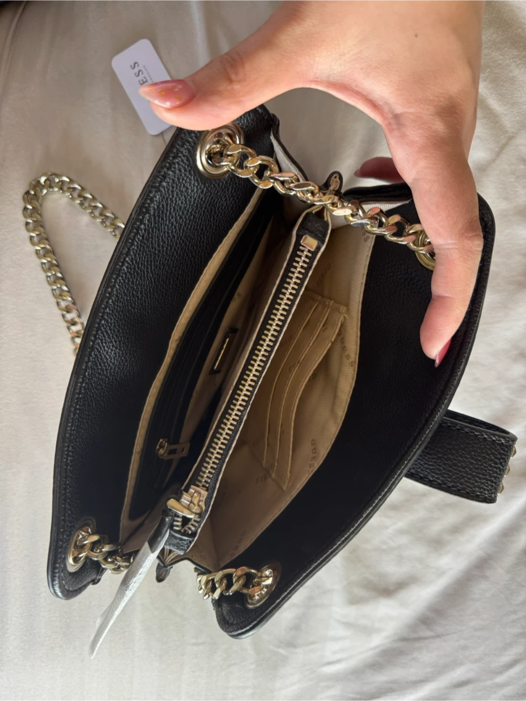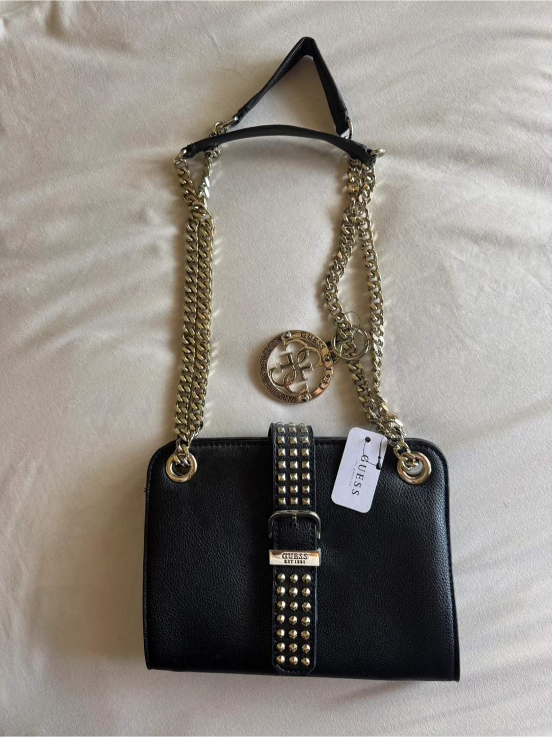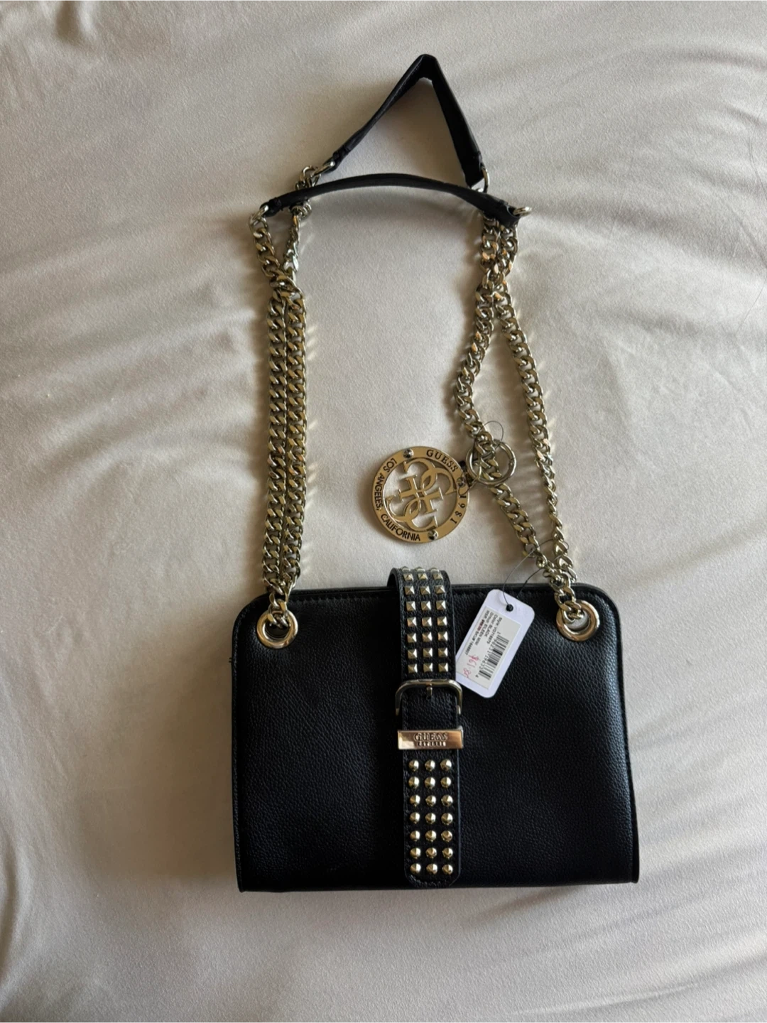 This is a black shoulder bag from Guess. It's made of faux leather and features a chain strap and studded details. It has a main compartment with a zip pocket and card slots inside.