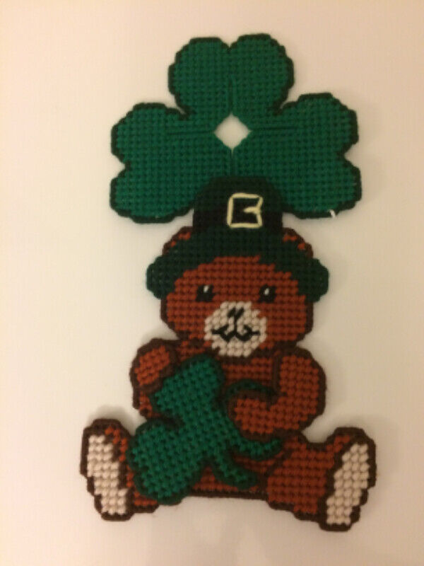 St. Patrick’s Day door handle hanger decoration for sale. New, handcrafted. Features a green four-leaf clover and a teddy bear in an Irish hat. Perfect for decorating your door handle, wall, or anywhere else! A lovely decorative piece to celebrate the holiday, your Irish heritage, or your teddy bear collection. $10. Located near the Burlington/Oakville border. Cash accepted.