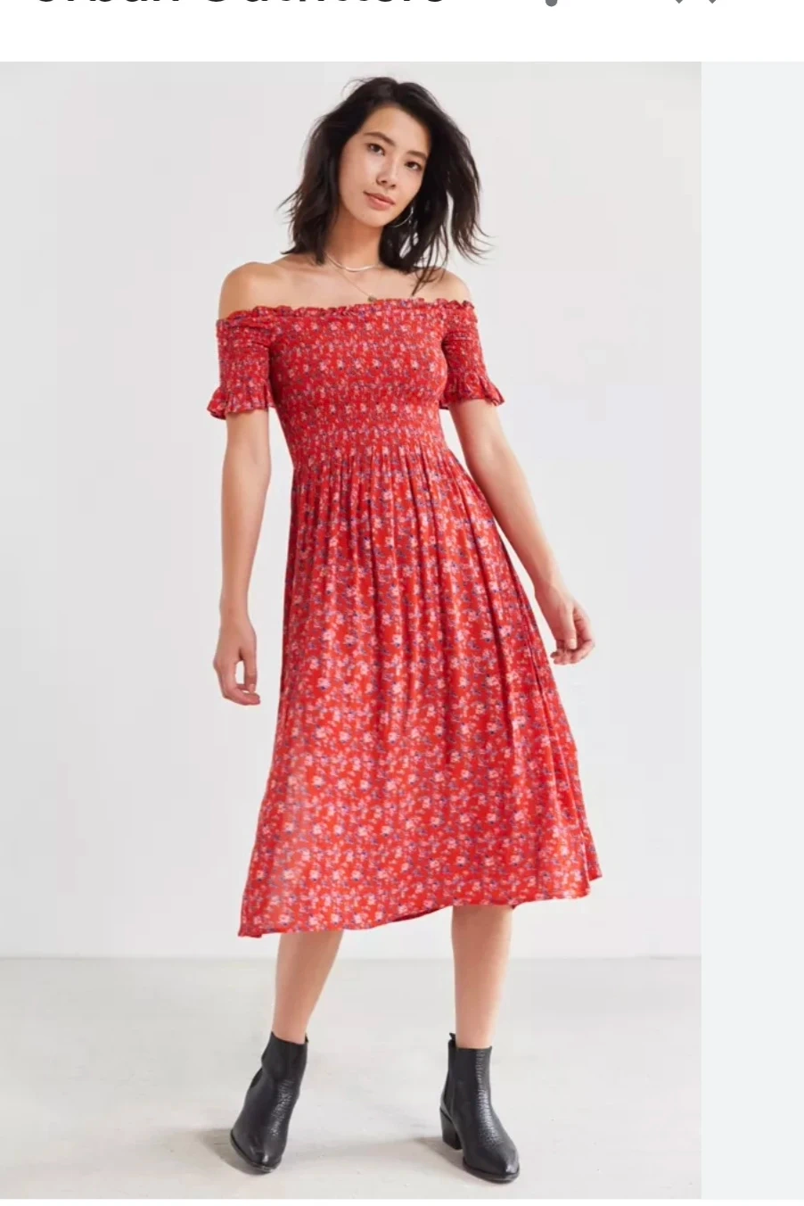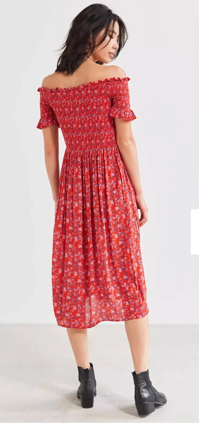 Red Floral Smocked Off-the-Shoulder Midi Dress