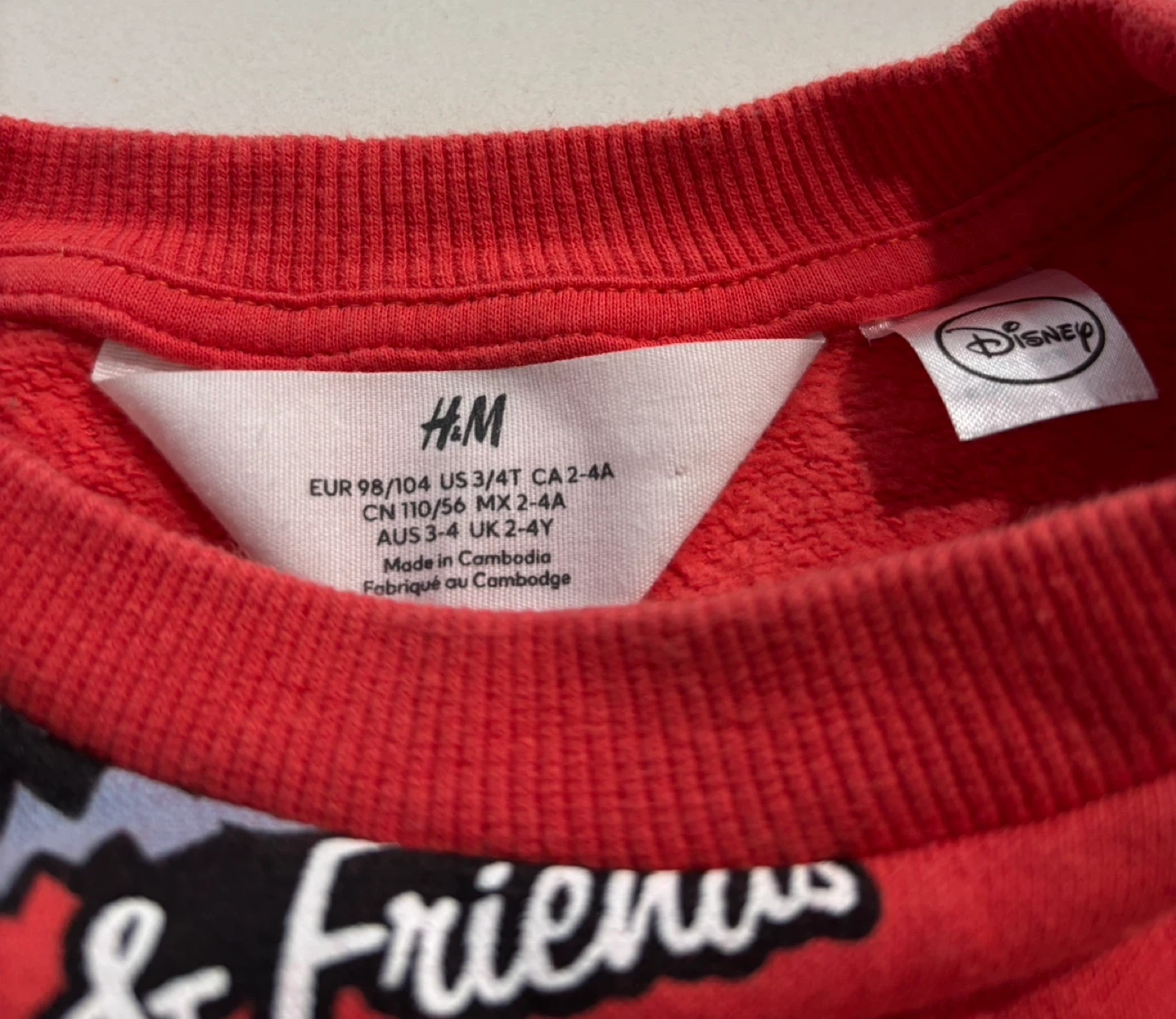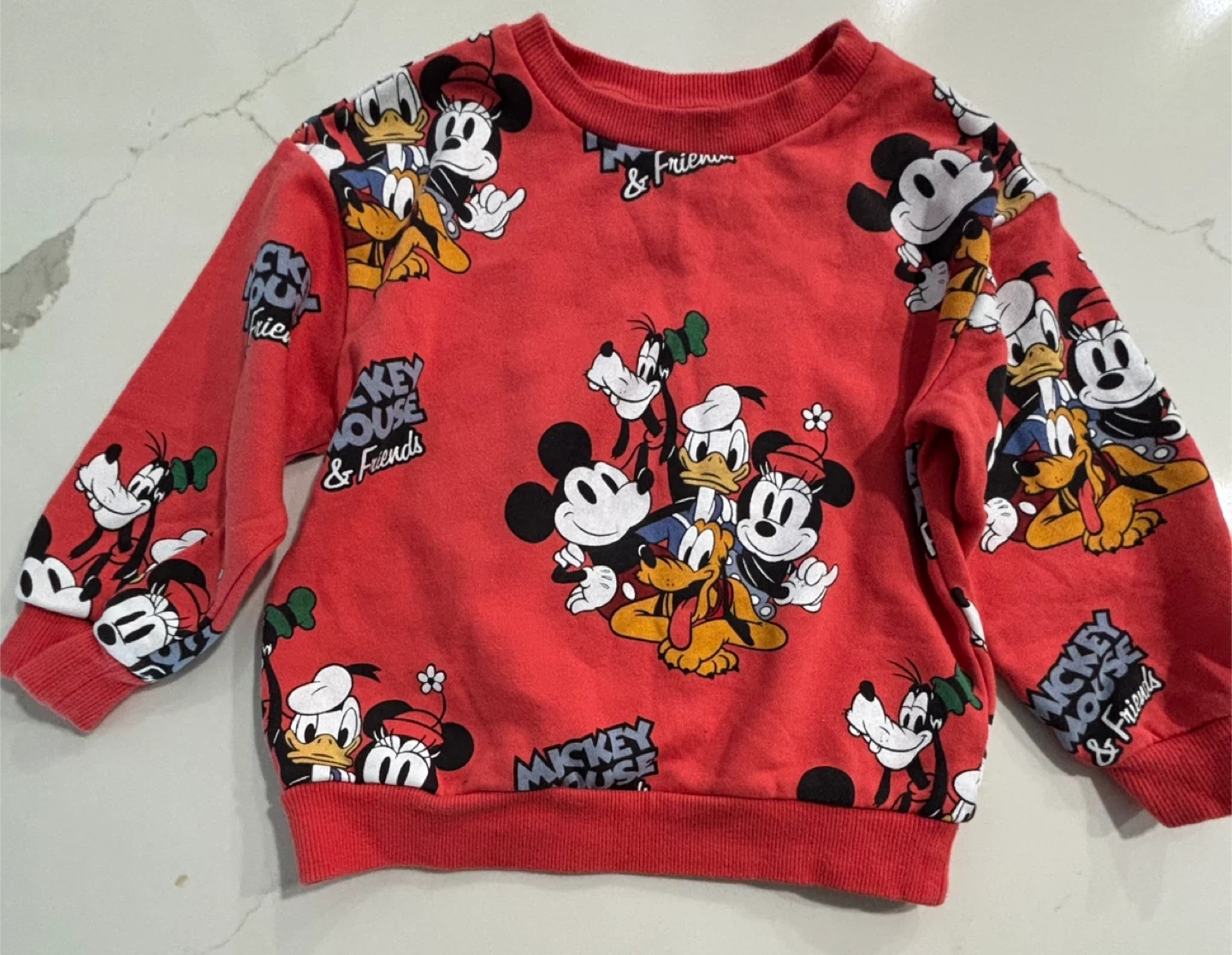 Like New. Red crewneck sweatshirt with a full print of Mickey Mouse and friends. Size US 3/4T CA 2-4A.