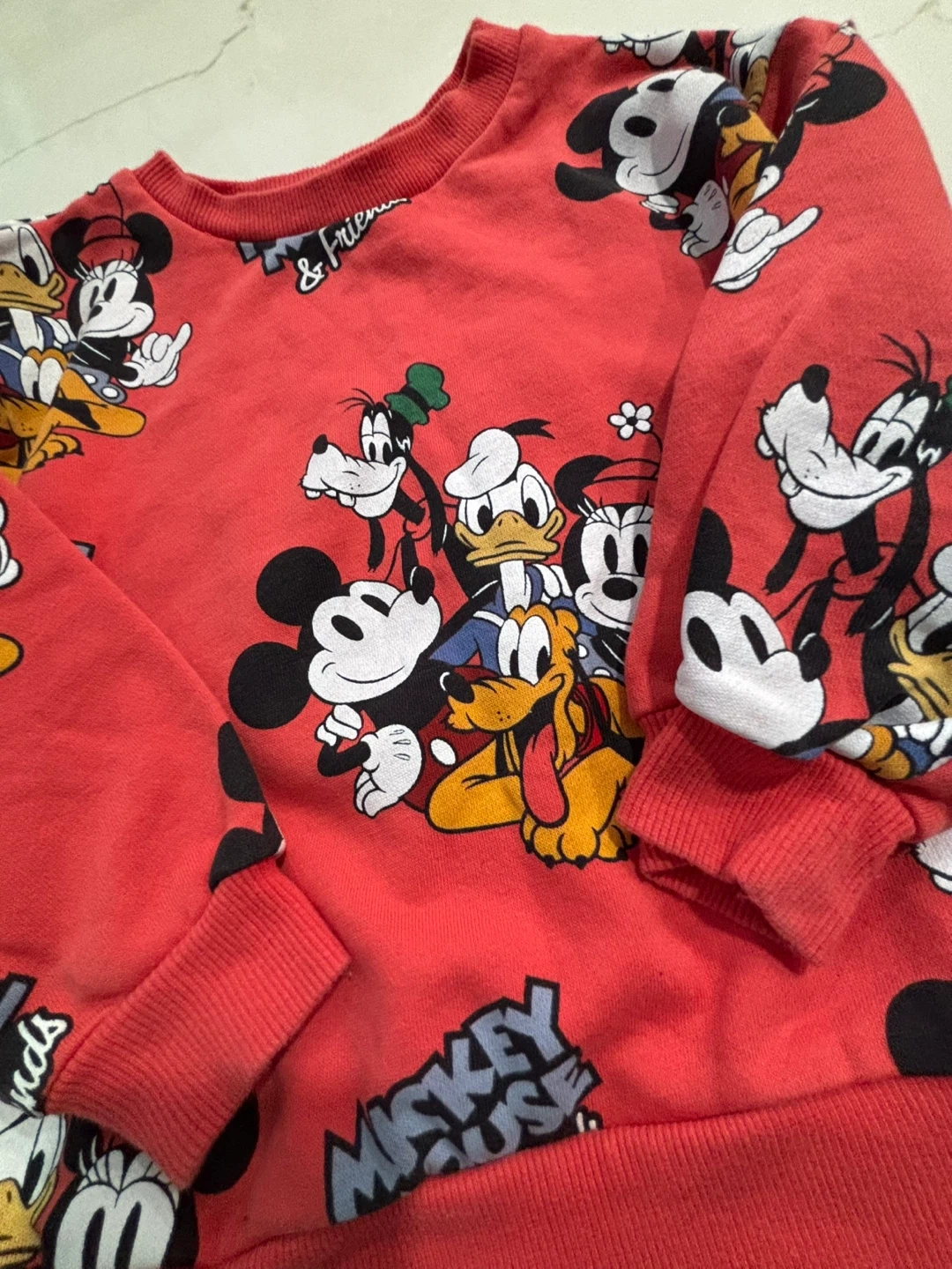 Like New. Red crewneck sweatshirt with a full print of Mickey Mouse and friends. Size US 3/4T CA 2-4A.