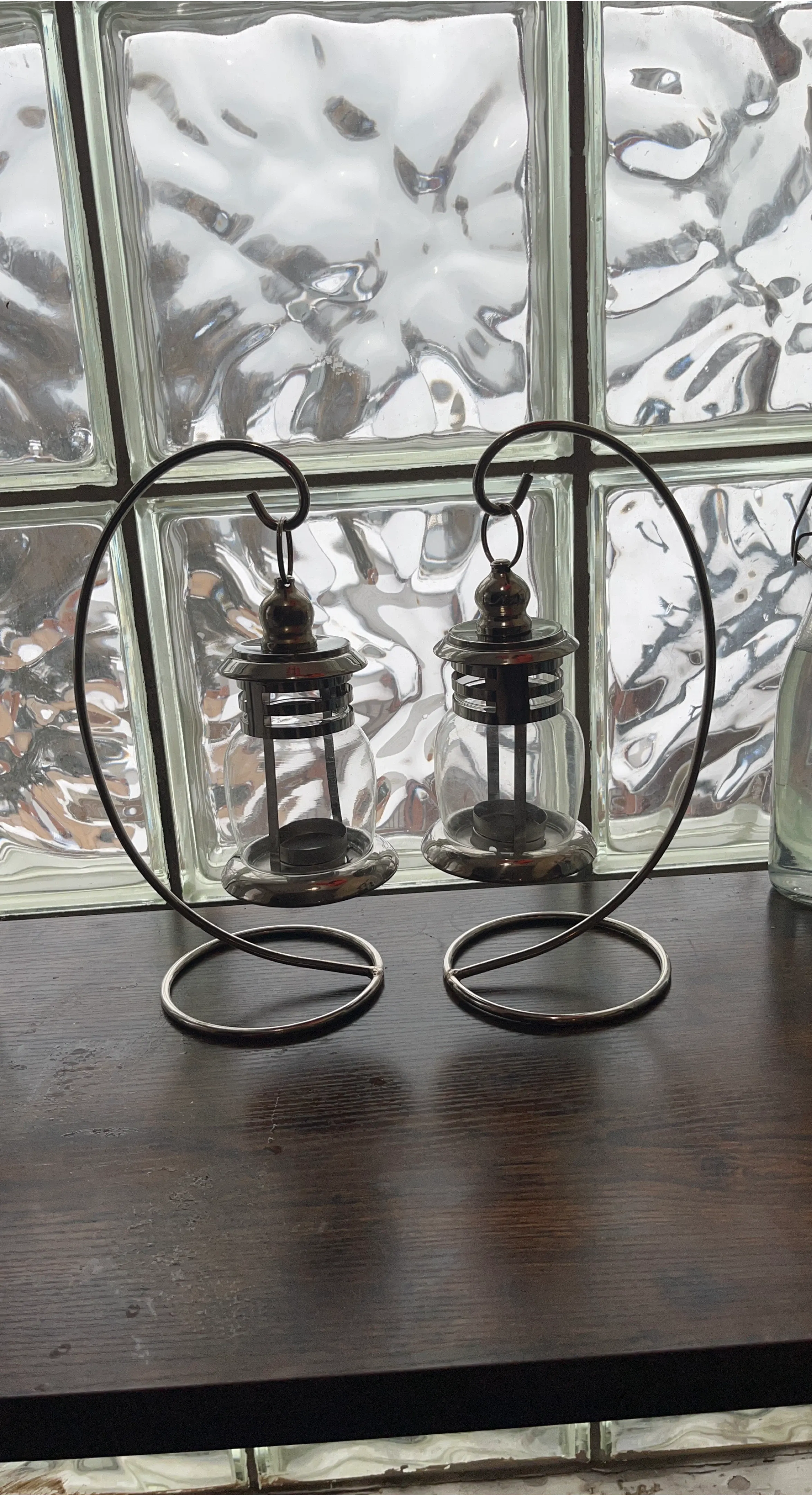 This is a set of two decorative glass lanterns, each supported by a metal stand with a heart-shaped curve. The lanterns have clear glass bodies and dark metal frames with ornate tops. They're suitable for small candles or tealights to add a cozy ambiance.