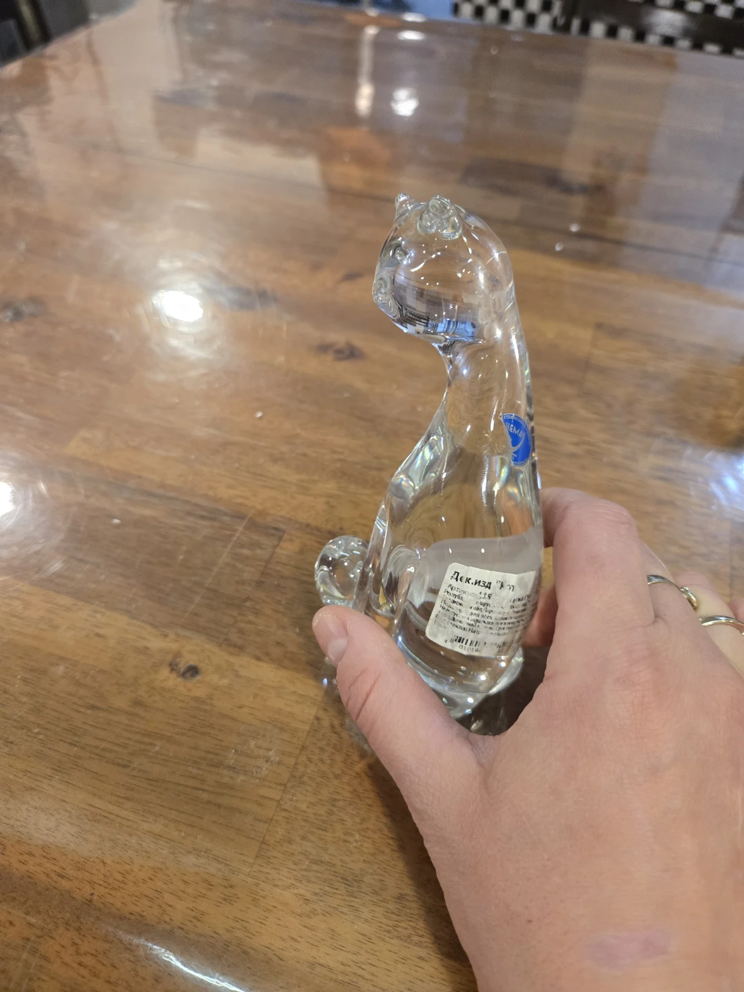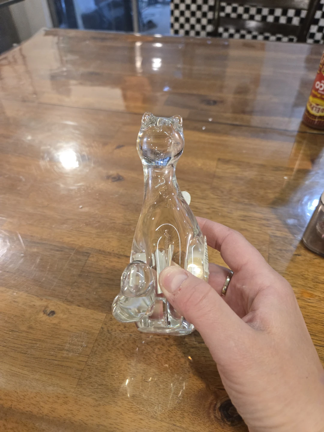 This is a cute clear glass cat figurine! It's in great condition and would look lovely on a shelf or desk.