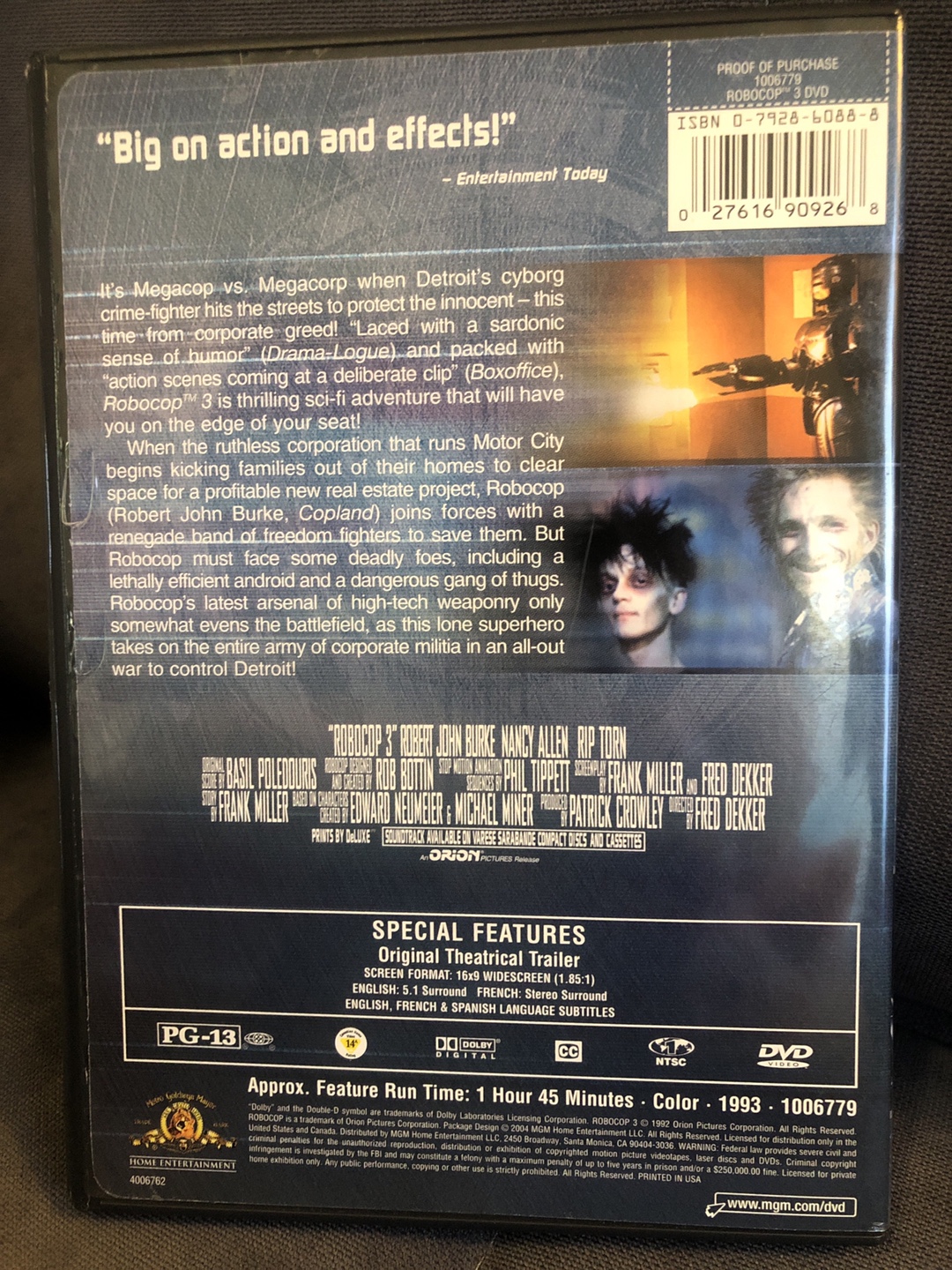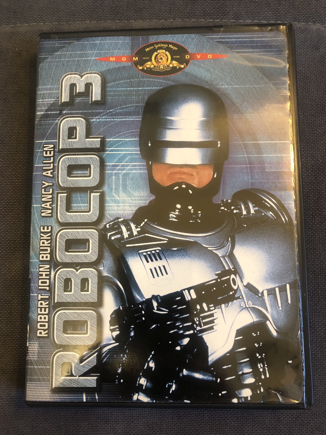 Selling a DVD of Robocop 3! This action-packed sci-fi movie is ready for a new home. It's a classic film for any collector or fan of the Robocop series. Enjoy the thrills and excitement of this movie night!