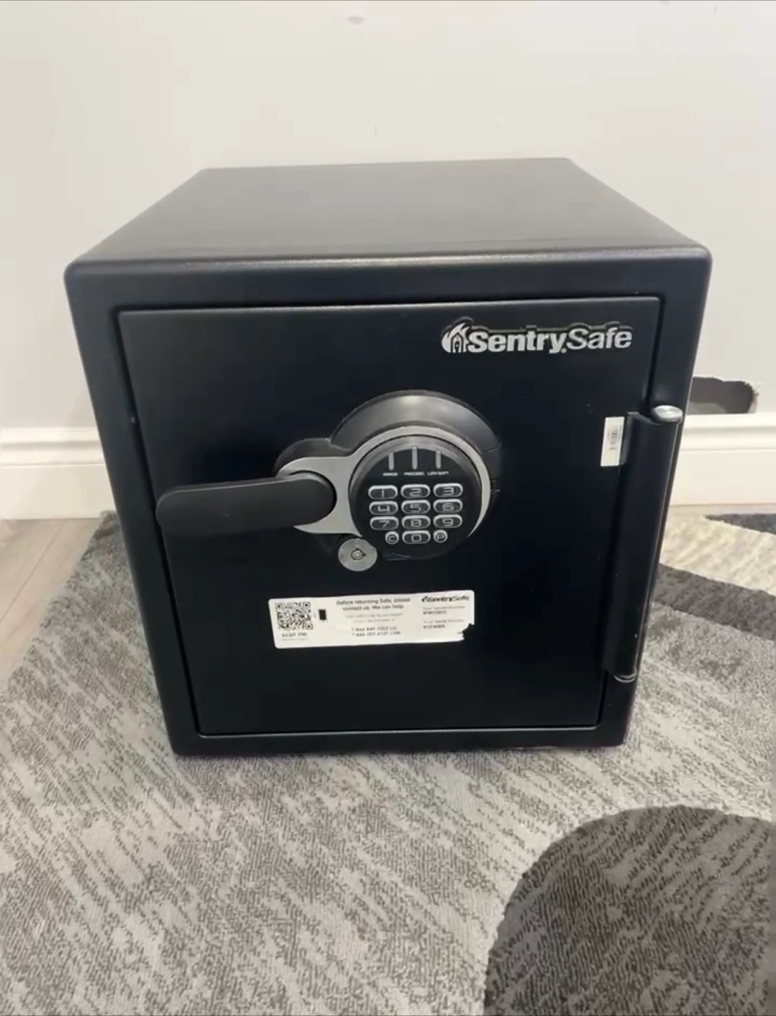 This SentrySafe digital lock safe is black and has a programmable electronic lock. It's ideal for securing important documents or valuables at home. Comes with one shelf inside.