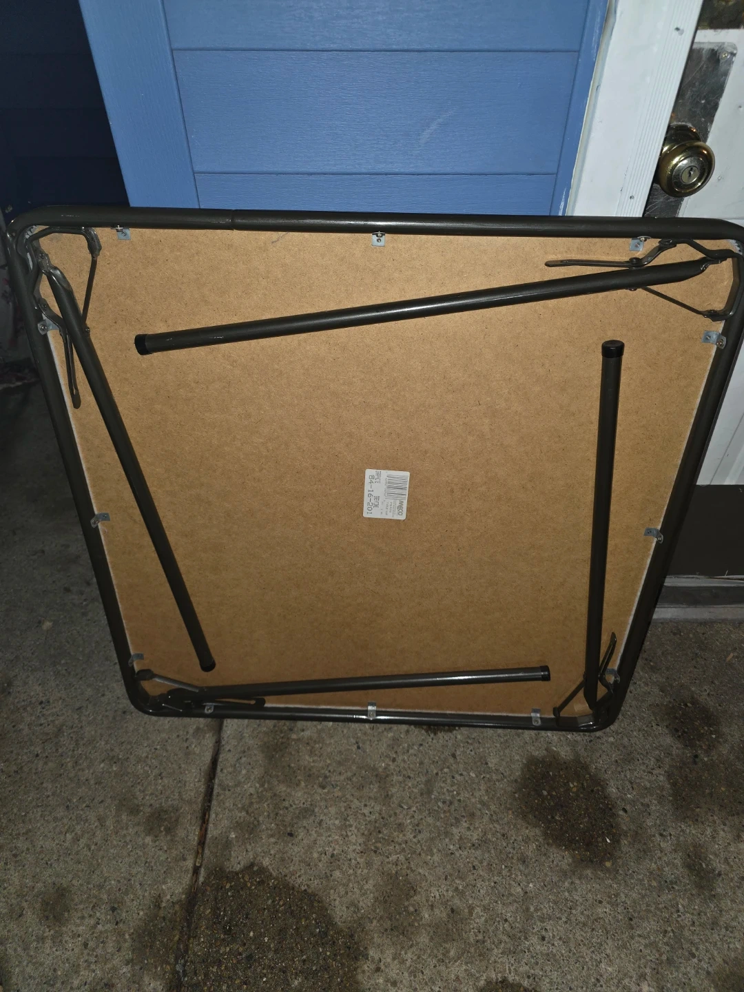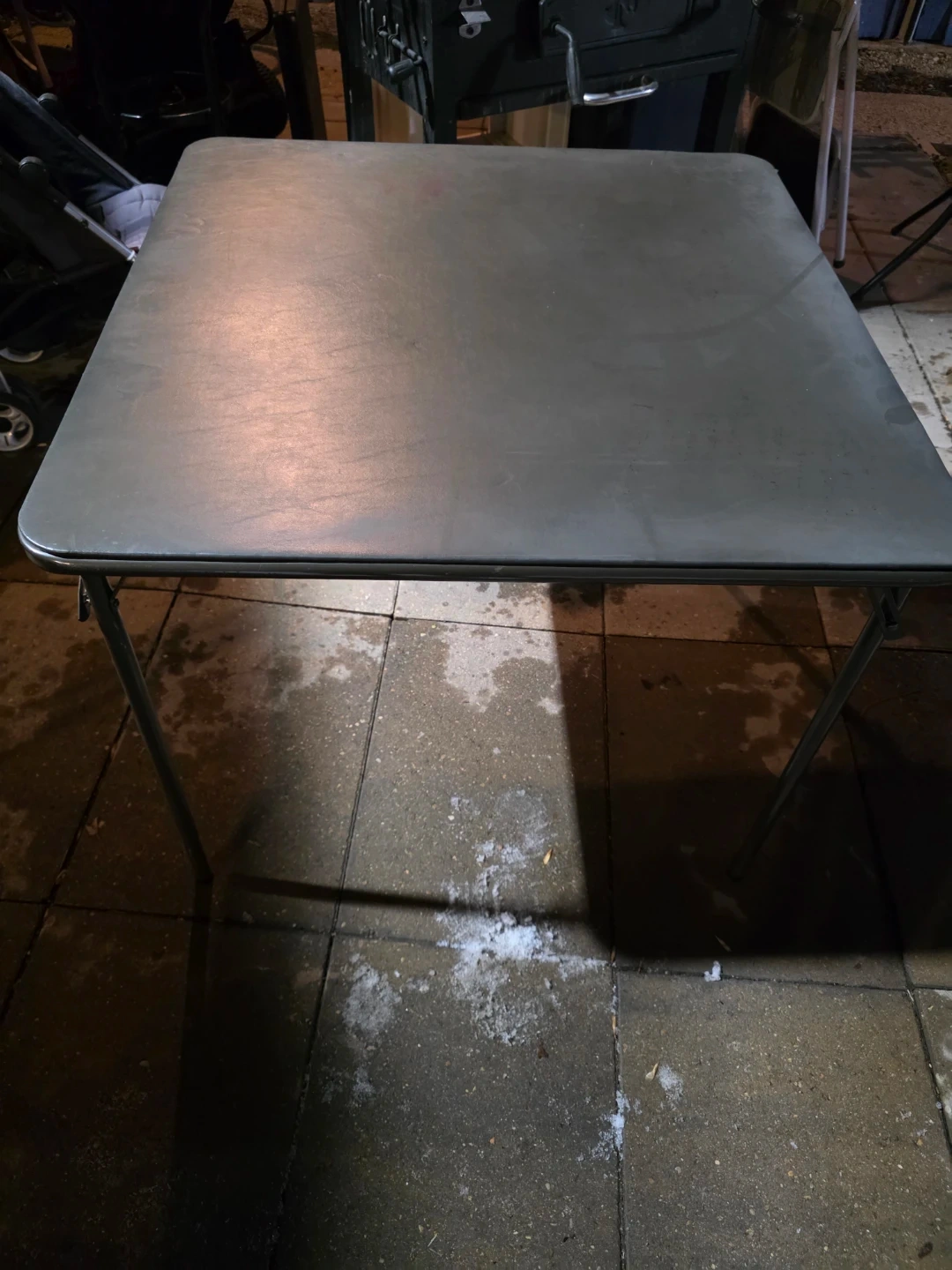 This is a sturdy folding card table, perfect for game nights or extra surface space. The tabletop is a durable gray material and it's supported by metal legs. It folds flat for easy storage.