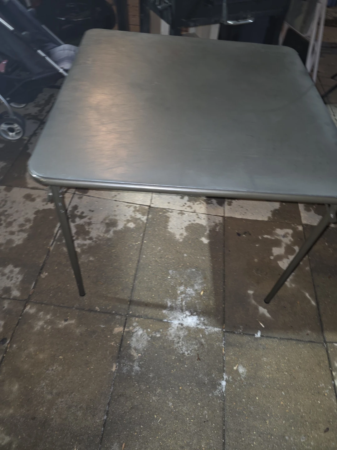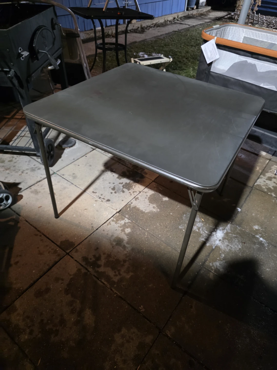 This is a sturdy folding card table, perfect for game nights or extra surface space. The tabletop is a durable gray material and it's supported by metal legs. It folds flat for easy storage.