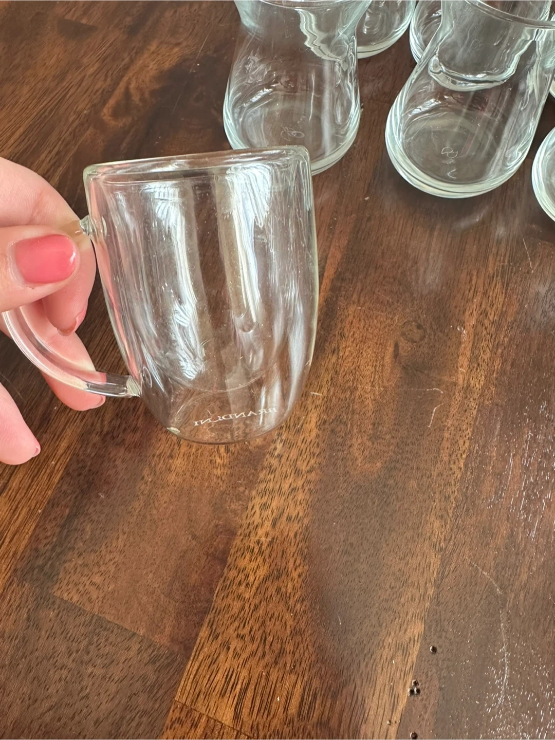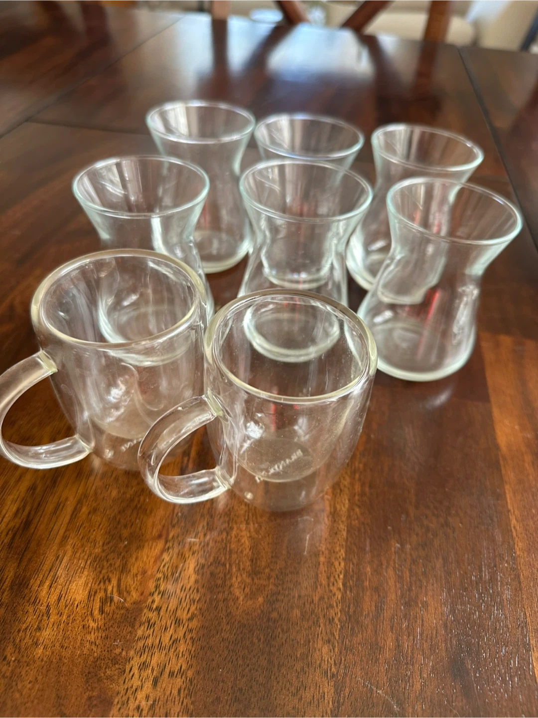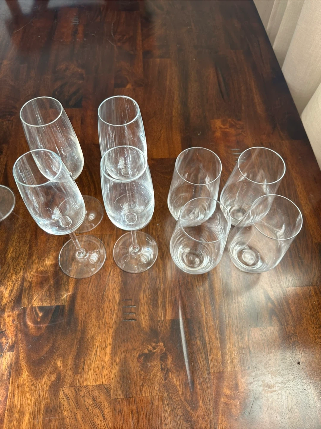 22 glasses. Collection of clear glass drinking glasses and wine glasses. Includes stemmed wine glasses, double-walled martini and small glasses. With complimentary stainless steel cocktail shaker and shots.