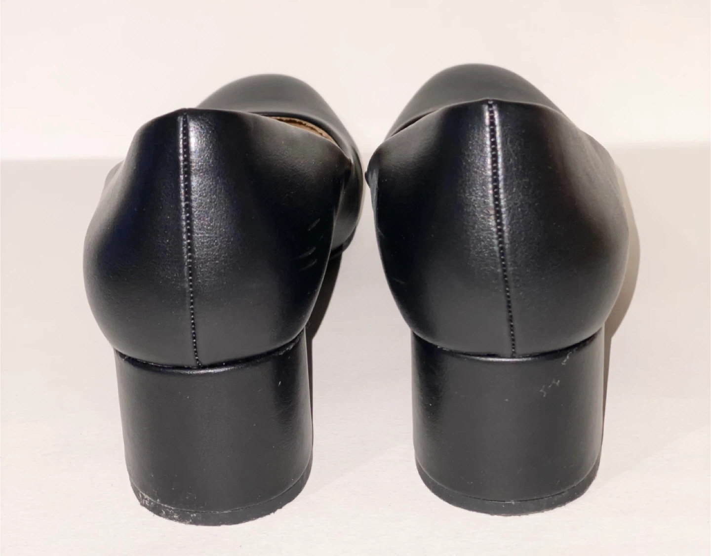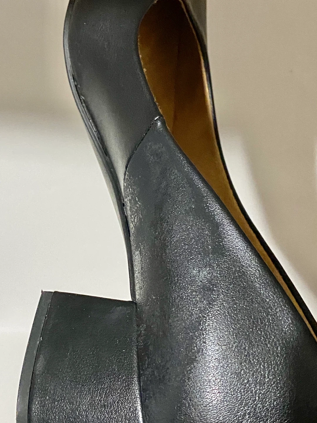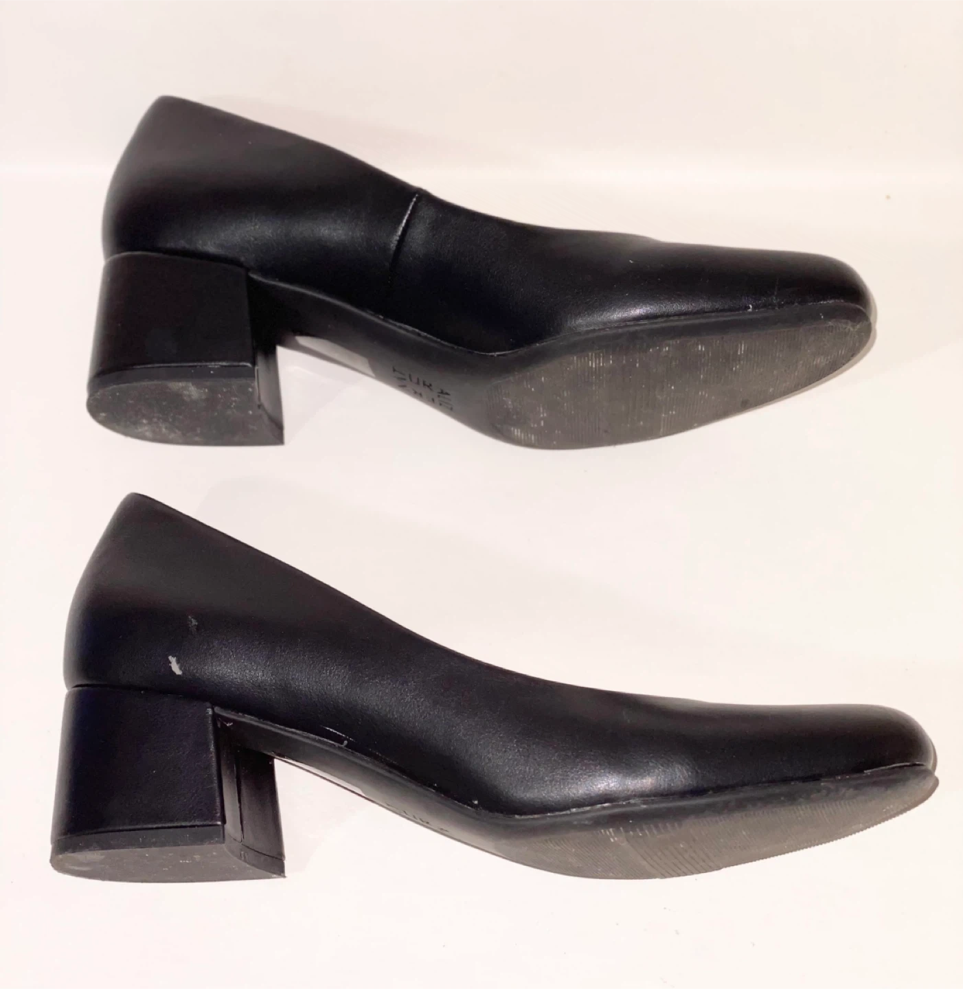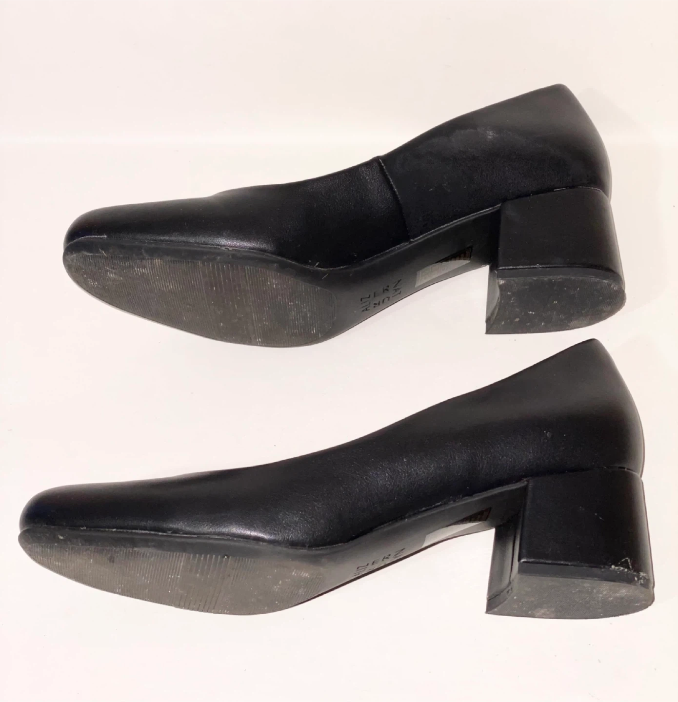 These Naturalizer pumps are crafted from black leather with a classic block heel. The inner sole shows a natural tan colour. They offer a versatile style for various occasions. They have general wear from being worn. The box has some damage and wear.