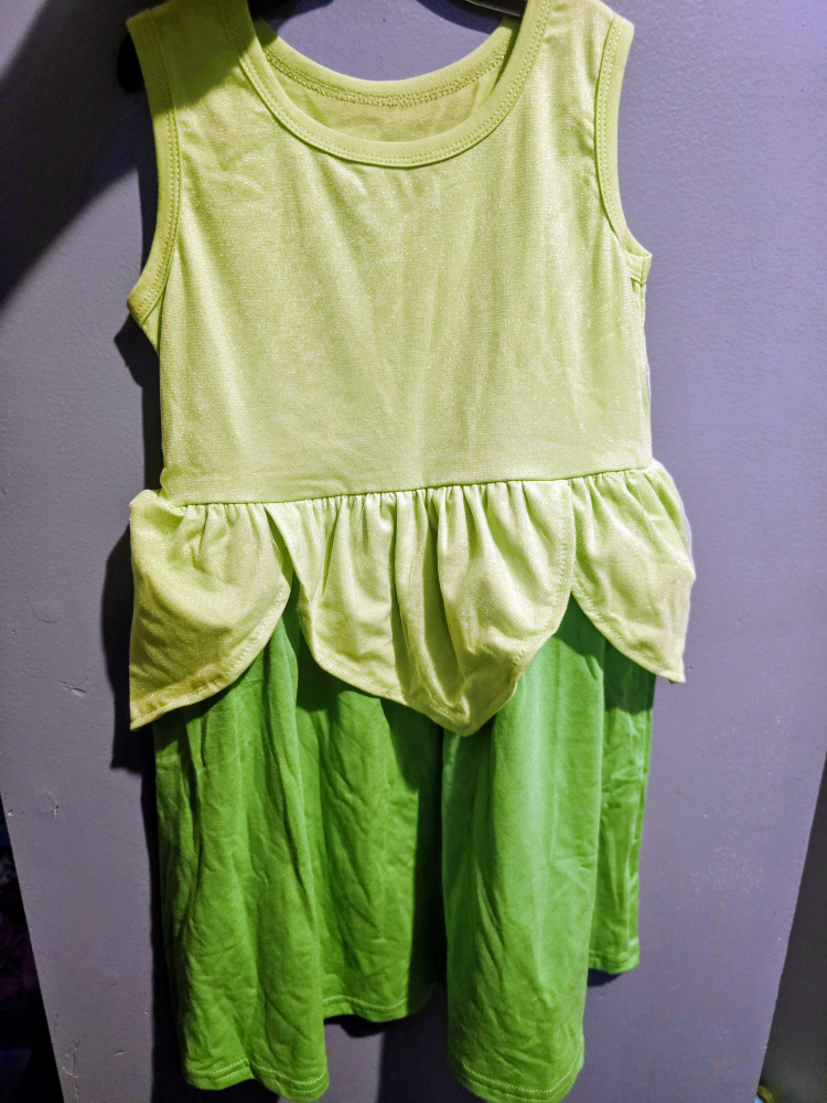 This adorable Disney Tinkerbell dress is perfect for your little fairy! It's in great condition and ready for a new home. The dress features a light green top with a darker green skirt, and a cute petal-like design at the waist. Size is 6/7