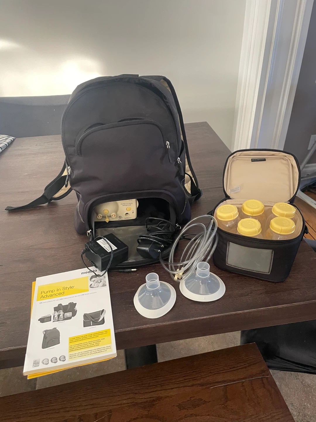 This is a Medela Pump In Style Advanced breast pump, complete with a backpack and accessories. It includes the pump, tubing, breast shields, and a cooler bag with bottles. All components are organized within the backpack for easy transport.