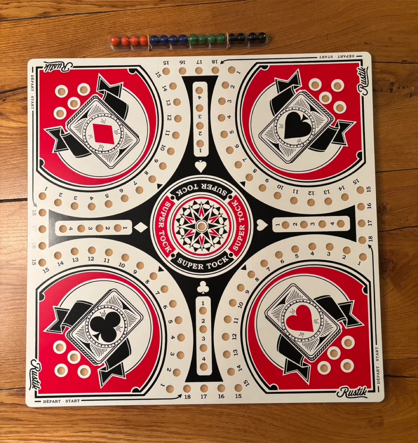 This is a Super Tock board game. It includes a game board and marbles for playing. It's designed for fun family game nights! Board is 20” square, made of wood. Perfect condition.
