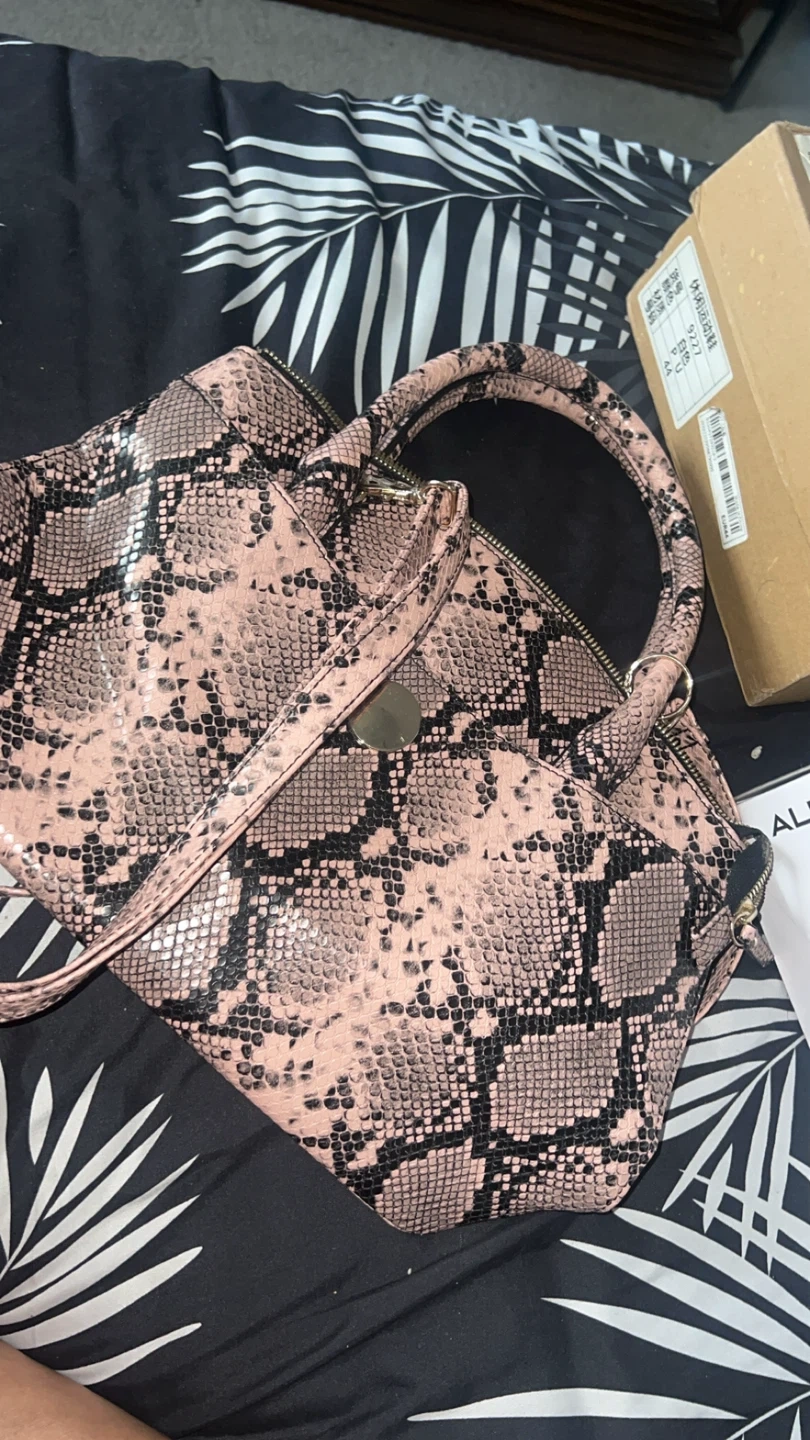 Stylish pink handbag with a snake print design. It has a top handle and a detachable strap. Zipper closure.