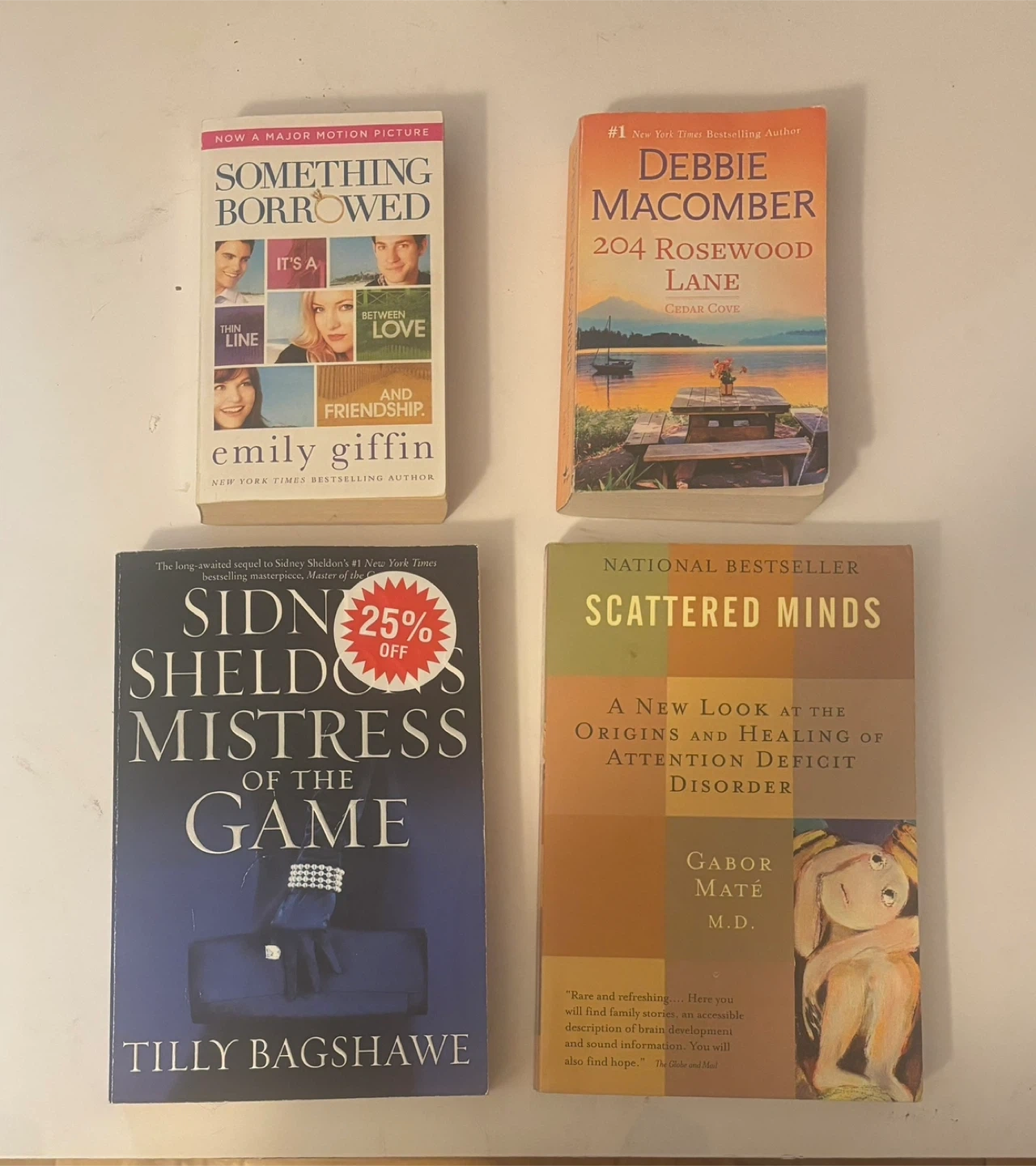 This lot includes multiple paperback and hardcover books by various bestselling authors. Authors featured are Kathy Reichs, Patricia Cornwell, Debbie Macomber, Emily Giffin, Sidney Sheldon, and Gabor Maté. Some of the Authors' names and book titles are visible in the photos.