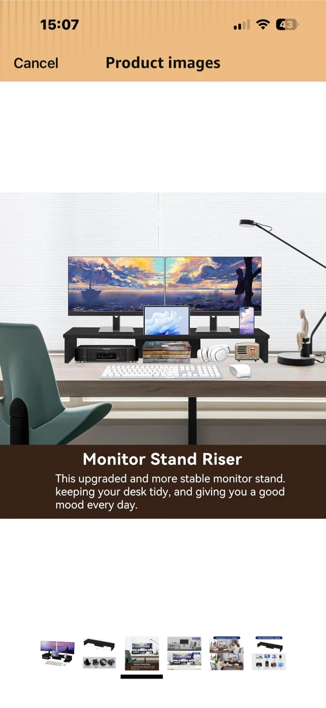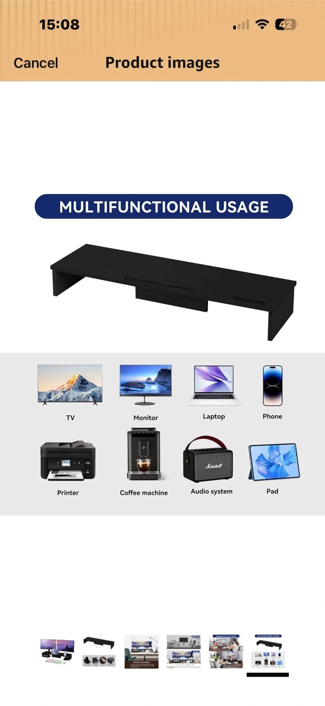 This black monitor stand riser measures 35.8 inches long, 10.2 inches deep, and 4.9 inches high. It offers a phone/pad holder slot and a laptop desk surface. It's easy to clean and has a sturdy construction.