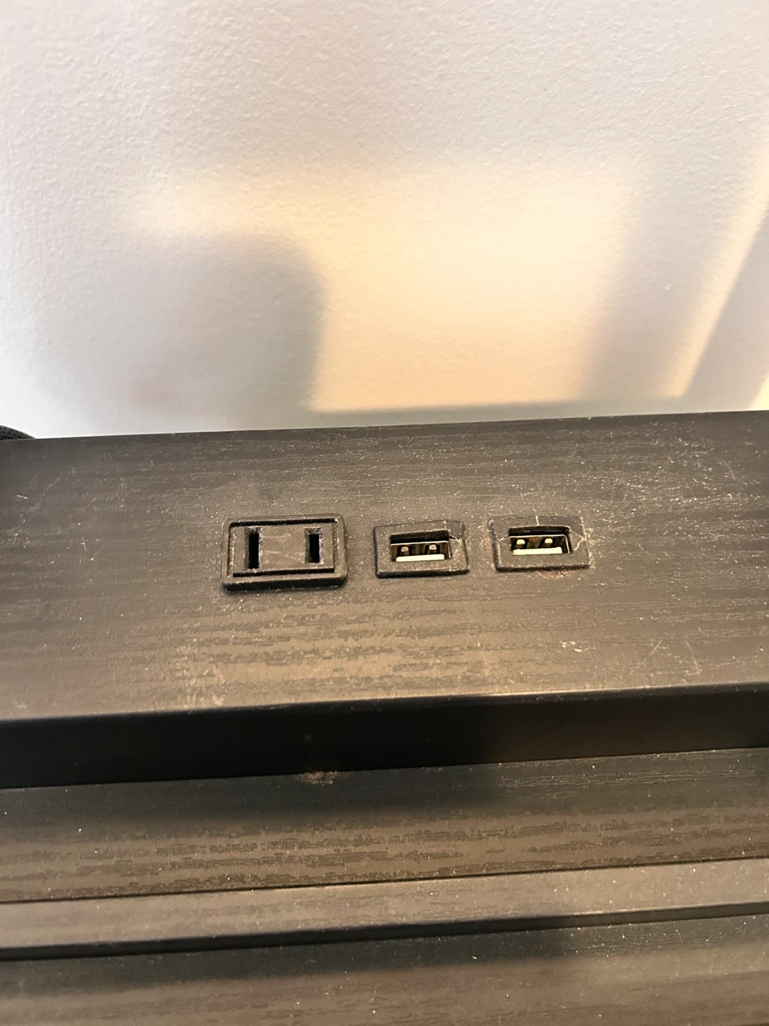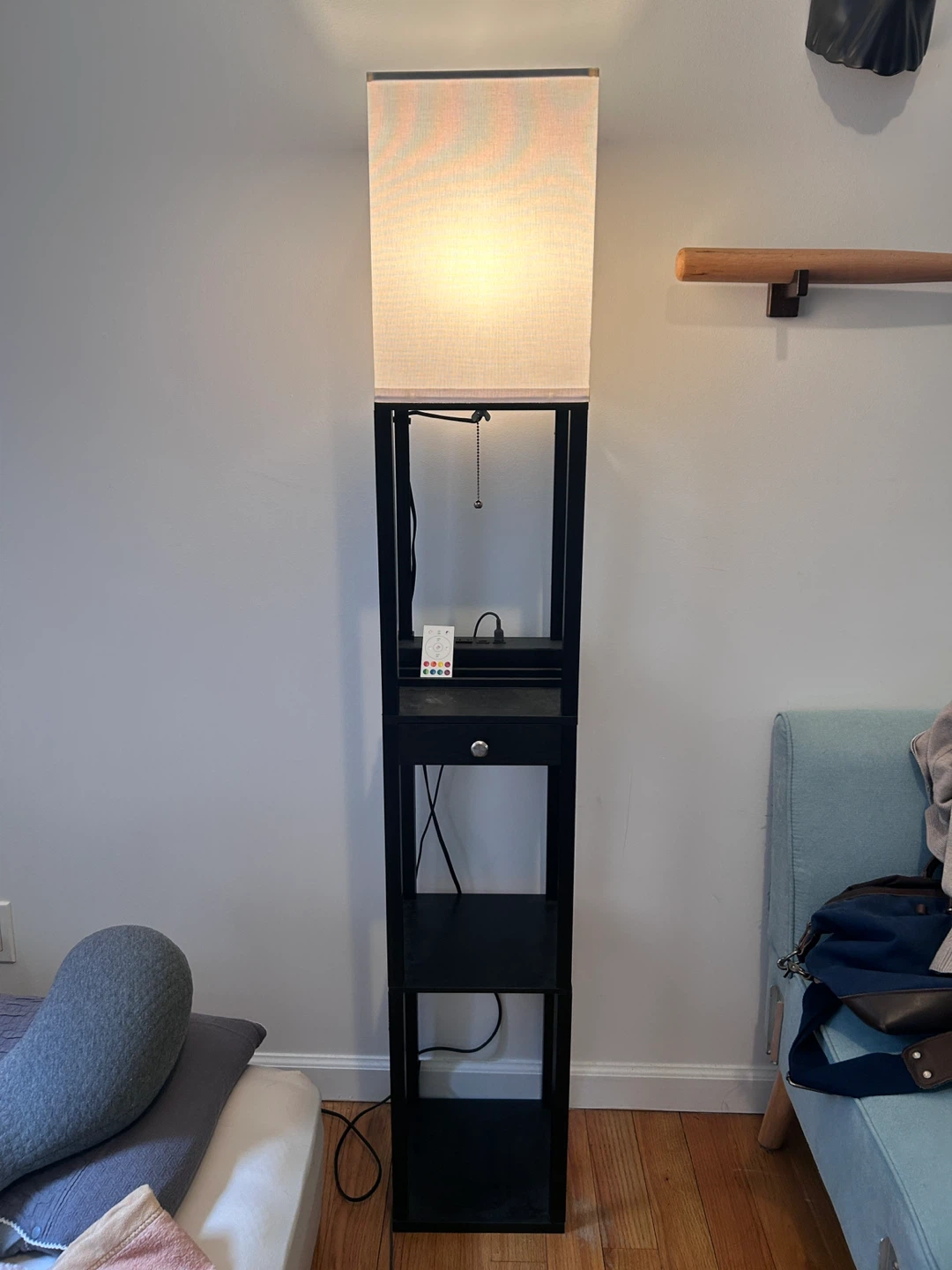 Tall black floor lamp with integrated shelving and a convenient drawer. It features USB ports and a standard outlet for charging devices. Includes a remote for light control and color options. A functional accent piece for any room!