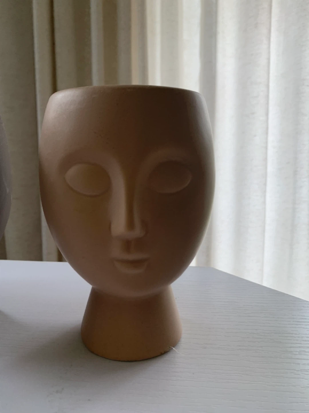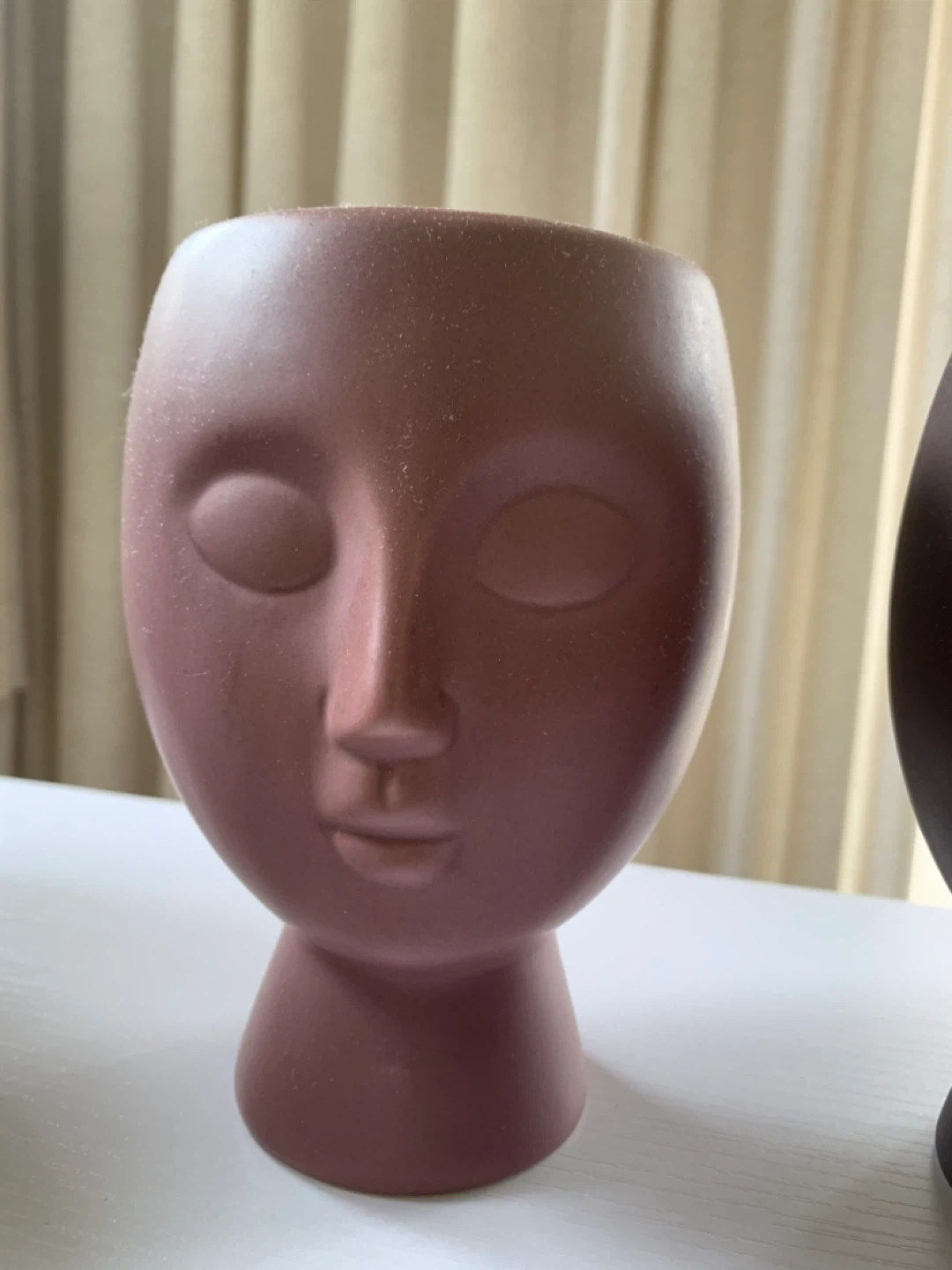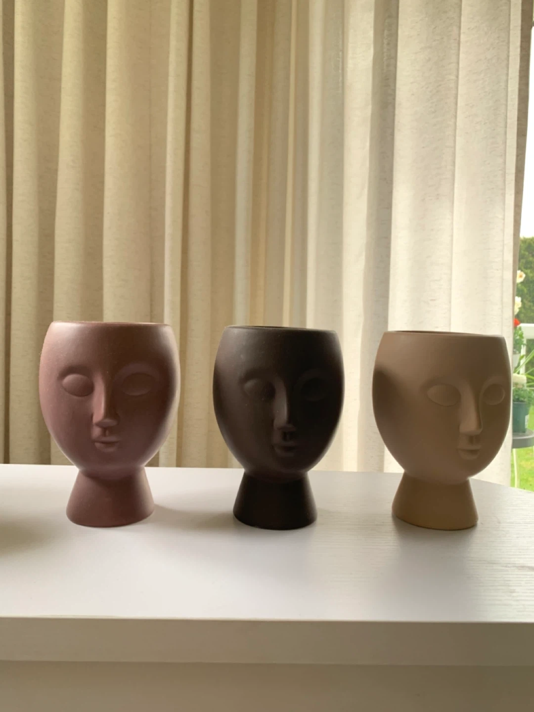 Set of three decorative planters shaped like human faces. Made from ceramic material in dusty rose, dark brown, and beige colours. These unique pots add a touch of artistic flair to any space. Suitable for small plants or as desk decor.